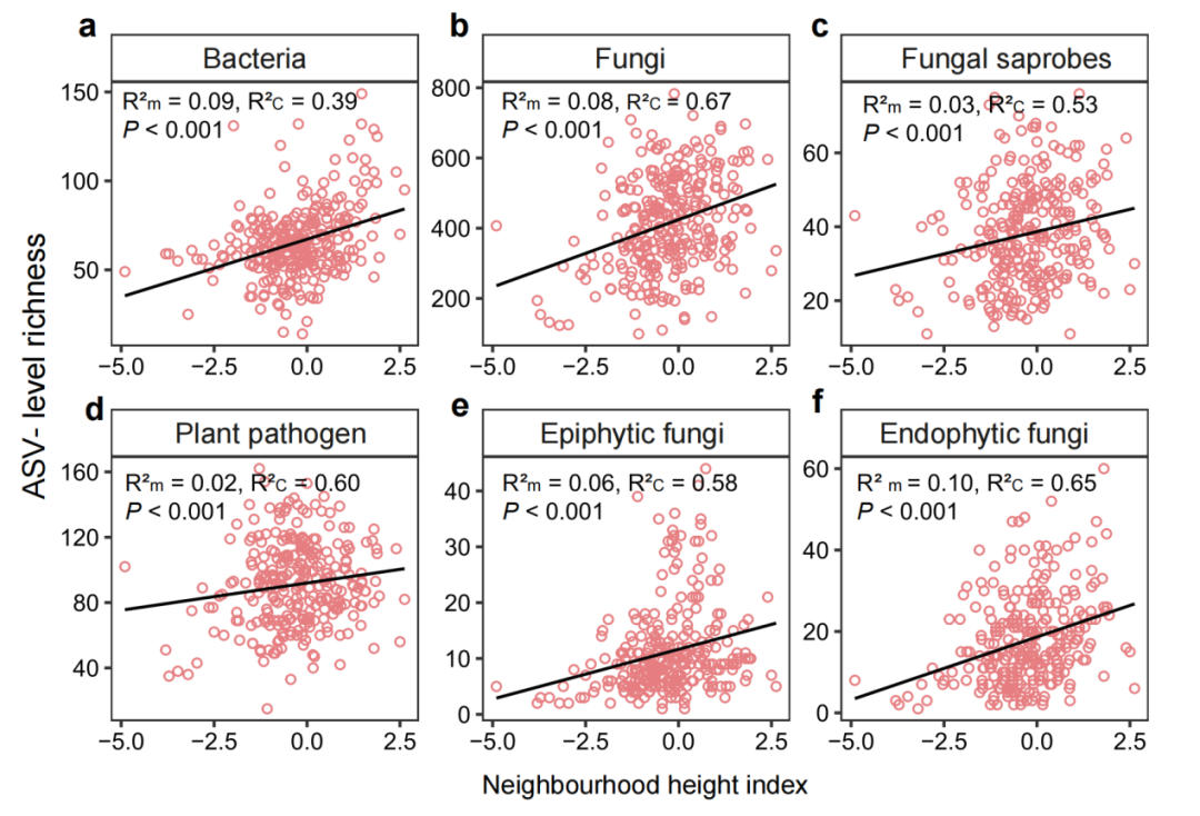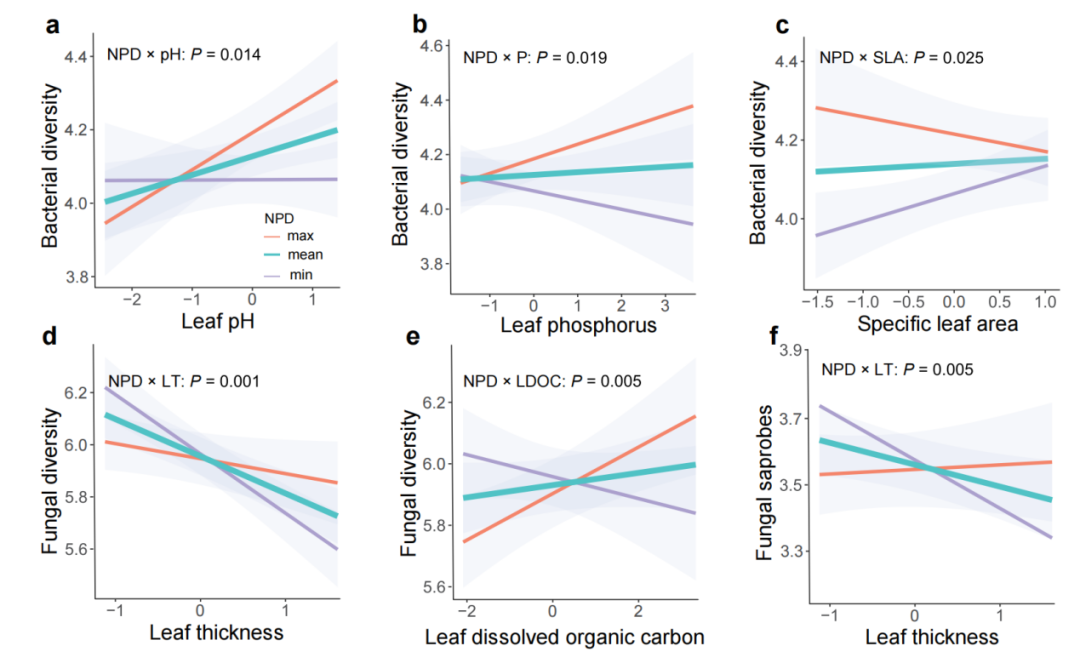 鉴于此,团队依托福建龙岩上杭的生物多样性与生态系统功能树种多样性实验平台(NaBEF),系统探讨了:宿主功能性状、邻体树种多样性和邻体竞争三者对叶际微生物多样性的调控机制。结果显示:(1)细菌多样性对宿主资源获取相关性状依赖性更强,而真菌多样性与植物生产力和防御性状密切相关。(2)邻体环境(邻体树种多样性和竞争)对叶际细菌的多样性作用更强,而宿主功能性状对真菌多样性的调控能力更强。(3)叶际微生物多样性与宿主性状间的关系随树种多样性增加而增强。这些研究结果表明树种多样性通过调节宿主资源策略与微环境条件,强化了植物-微生物间的生态互作。为理解生物多样性和森林生态系统功能提供了新的实验证据,也为预测森林在未来气候变化与生物多样性丧失背景下的生态稳定性提供了重要参考。