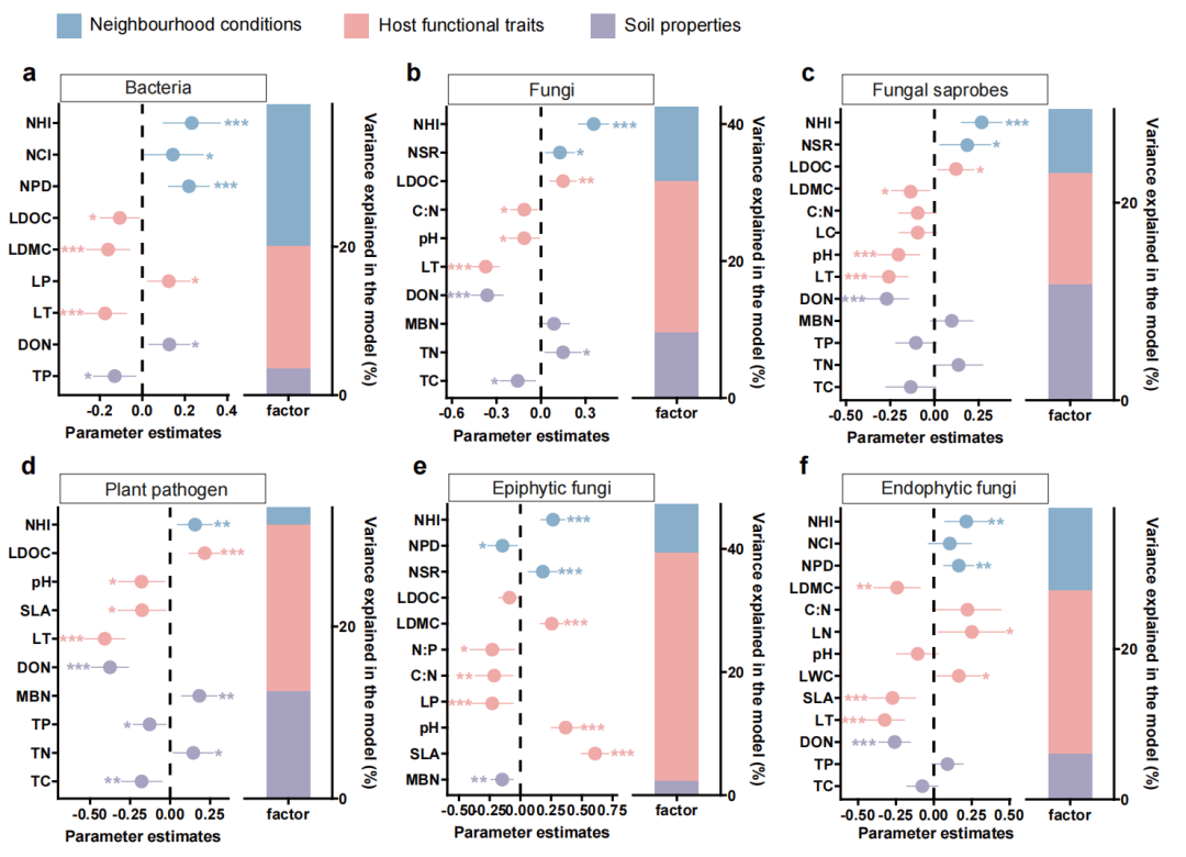 图3 邻体树种环境、宿主功能性状和土壤对叶际微生物多样性的驱动机制