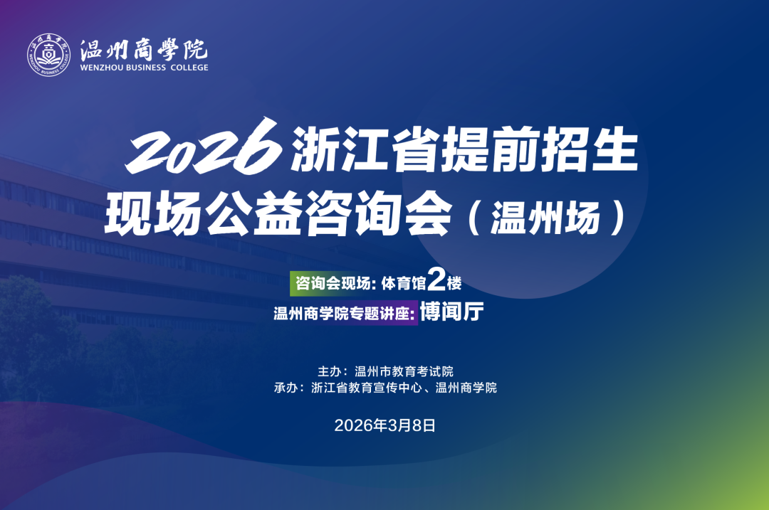为更好的服务考生,结合浙江省2026年提前招生工作进程,温州市教育考试院联合浙江省教育宣传中心、温州商学院,定于3月8日共同举办"2026年浙江省提前招生现场公益咨询会(温州站)",届时开展2026年提前招生的本专科院校将来到现场,与考生家长进行面对面咨询,相关安排如下: