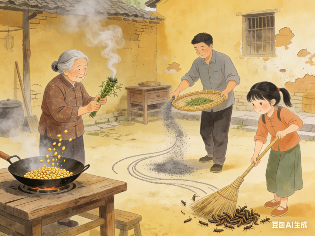 驱虫驱霉:香、撒灰、炒豆、扫虫,用烟火与声响赶走虫害霉气,祈求平安丰收。