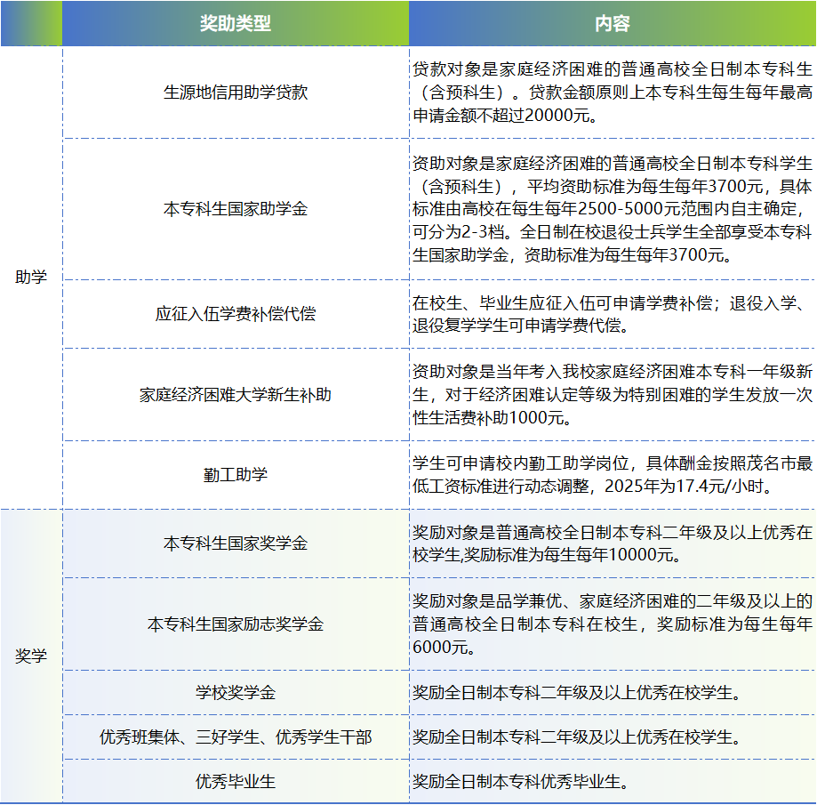PART.8资助政策学校依托国家政策搭建全方位、多维度的资助体系,以 “奖、助、贷、勤、免、补” 为支撑,为家庭经济困难学生筑起坚实后盾。