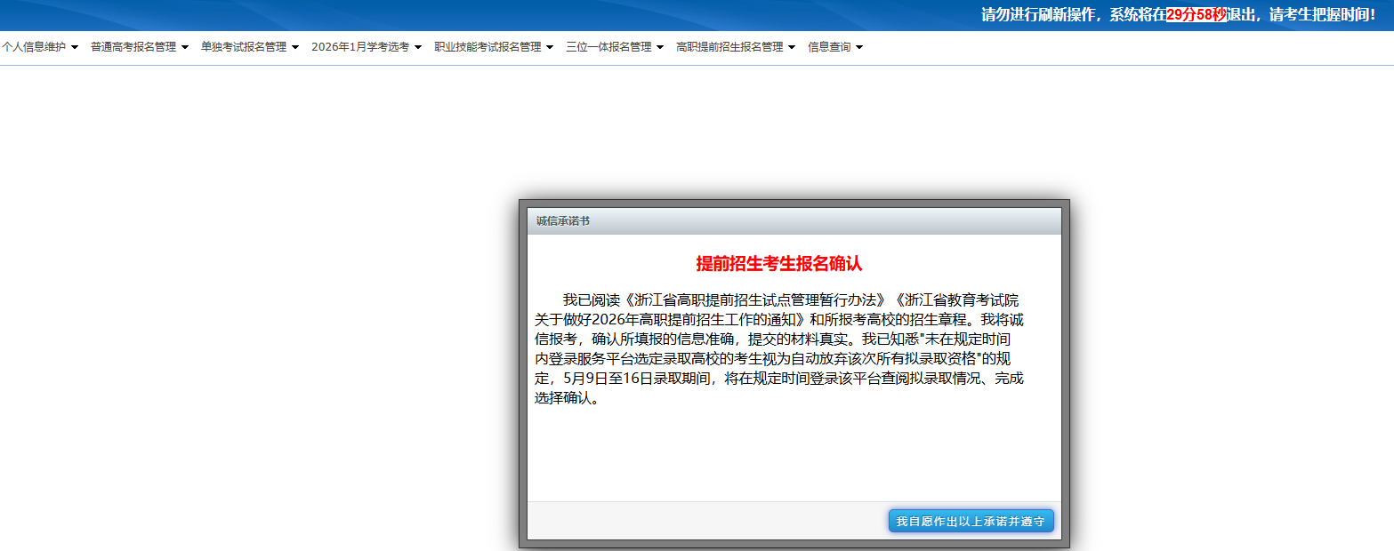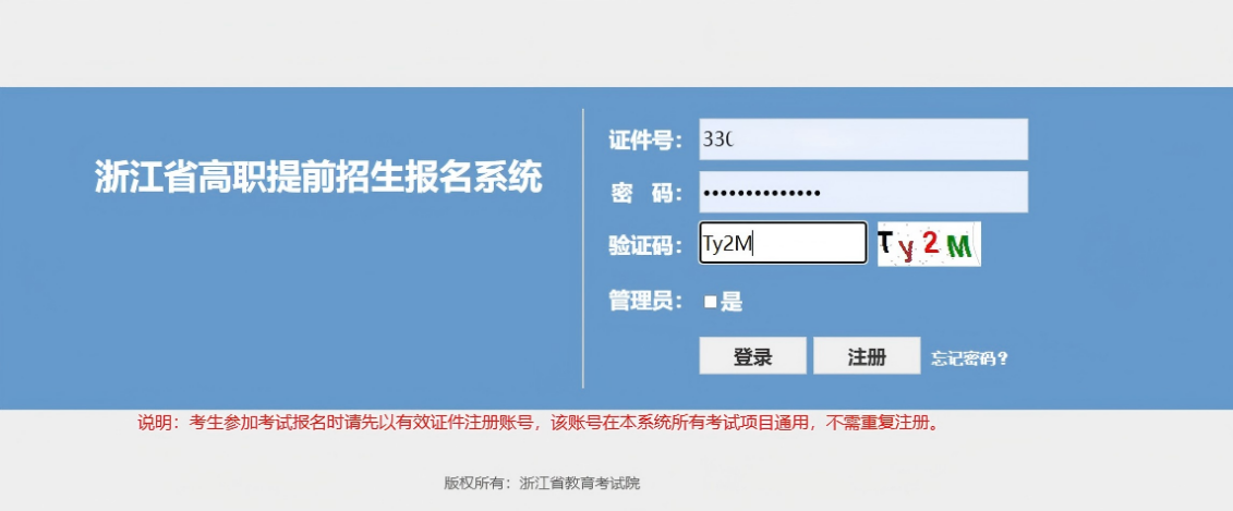 点击在线报名会跳转到浙江省高职提前招生报名系统,输入身份证号及密码登录(密码为高考招生报名系统密码)。登录系统后,仔细阅读弹窗内容,点击确认按钮后即可进入报名界面。