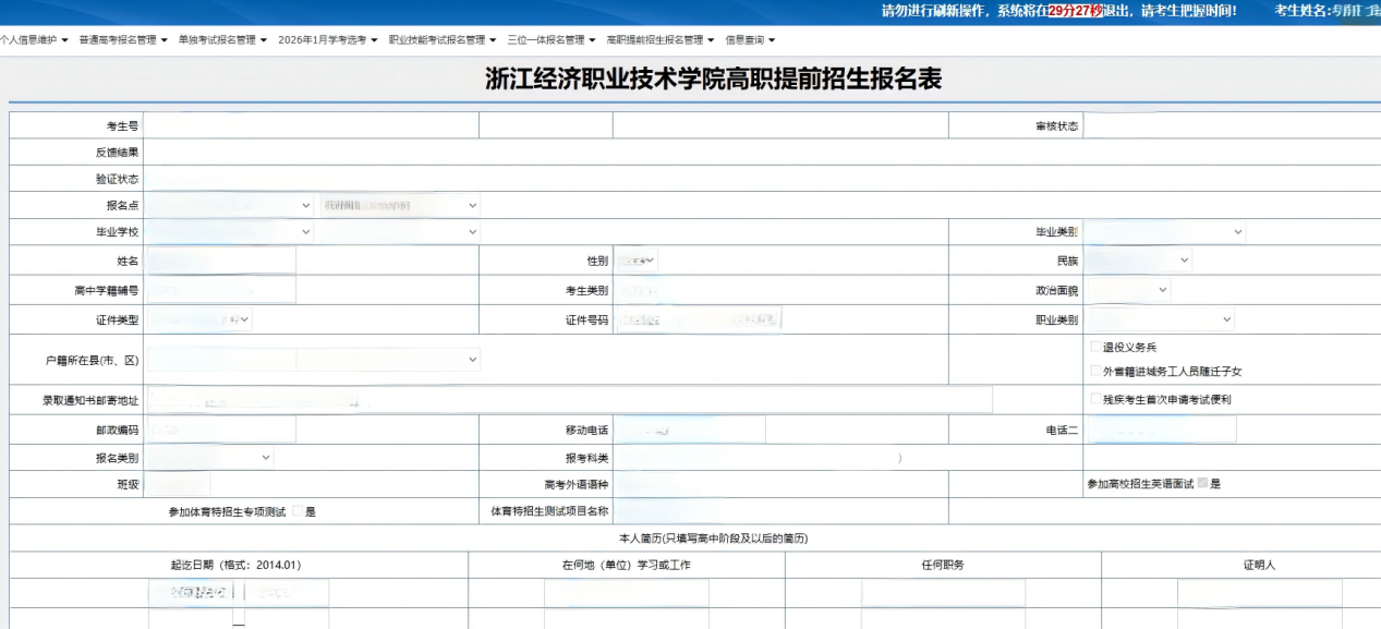 1.2026年浙江经济职业技术学院高职提前招生考生报名登记表