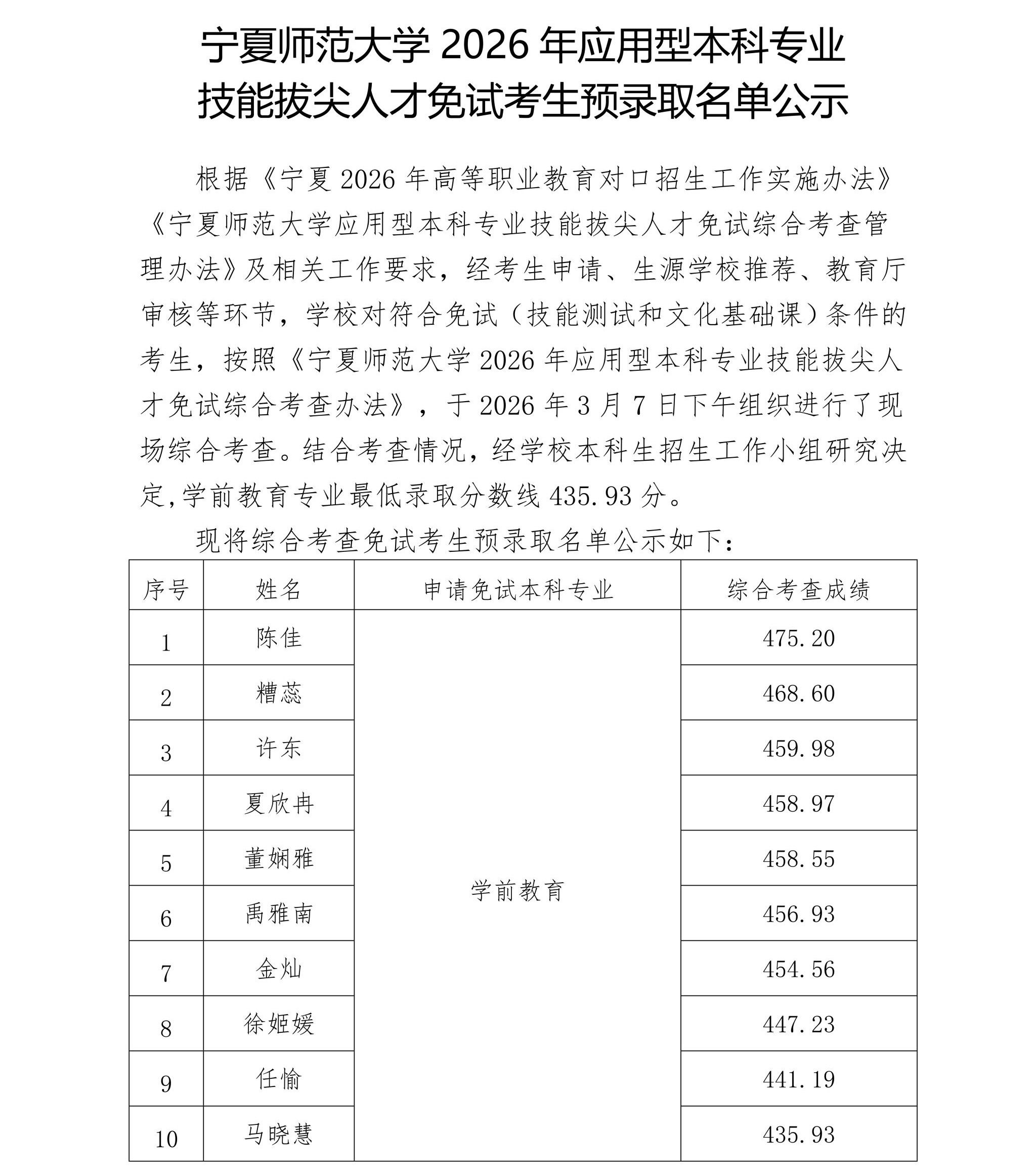 宁夏师范大学2026年应用型本科专业技能拔尖人才免试考生预录取名单公示