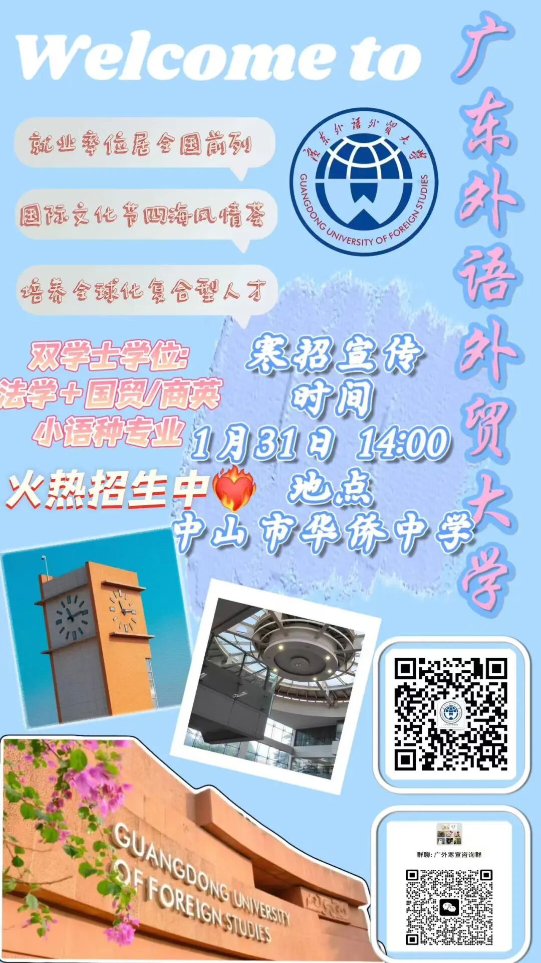 现场的答疑似乎不能满足学弟学妹们想要了解广外的热情,所以我们也在现场欢迎学弟学妹们进入我们的线上答疑群,用我们的热情,让学弟学妹们突破时间和空间的限制,为他们的梦想助力!