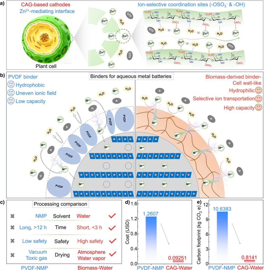 基于前期工作,该团队提出了一种新型ι-卡拉胶粘结剂用于加工二次水系金属电池电极,起到粘合电极活性物质、导电剂和集流体的作用。传统电池粘结剂(如聚偏氟乙烯)像一层“防水塑料膜”,导致电解液难以充分浸润电极材料,拖慢电池反应速度,造成电池容量降低等问题。研究团队创新性地以天然海藻中提取ι-卡拉胶(常见于冰淇淋、果冻的食品添加剂)作为粘合剂。这种绿色材料能够快速吸附电解液并均匀传递至电极每个角落,大幅提升材料利用率。对比传统聚偏氟乙烯粘结剂,使用卡拉胶粘合剂的电池容量飙升76%。此外,卡拉胶可生物降解,使得电极加工/回收过程不涉及有毒溶或者有机溶剂,显著降低污染,为新型二次金属电池贴上“绿色标签”。上述研究论文的发表是袁占辉教授团队在生物质水系电池材料基础研究方面取得的又一重要成果。