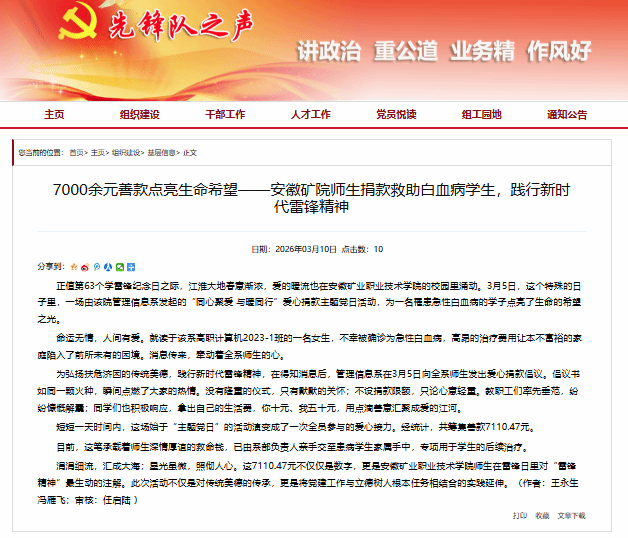 正值第63个学雷锋纪念日之际,江淮大地春意渐浓,爱的暖流也在安徽矿业职业技术学院的校园里涌动。3月5日,这个特殊的日子里,一场由该院管理信息系发起的“同心聚爱 与暖同行”爱心捐款主题党日活动,为一名罹患急性白血病的学子点亮了生命的希望之光。