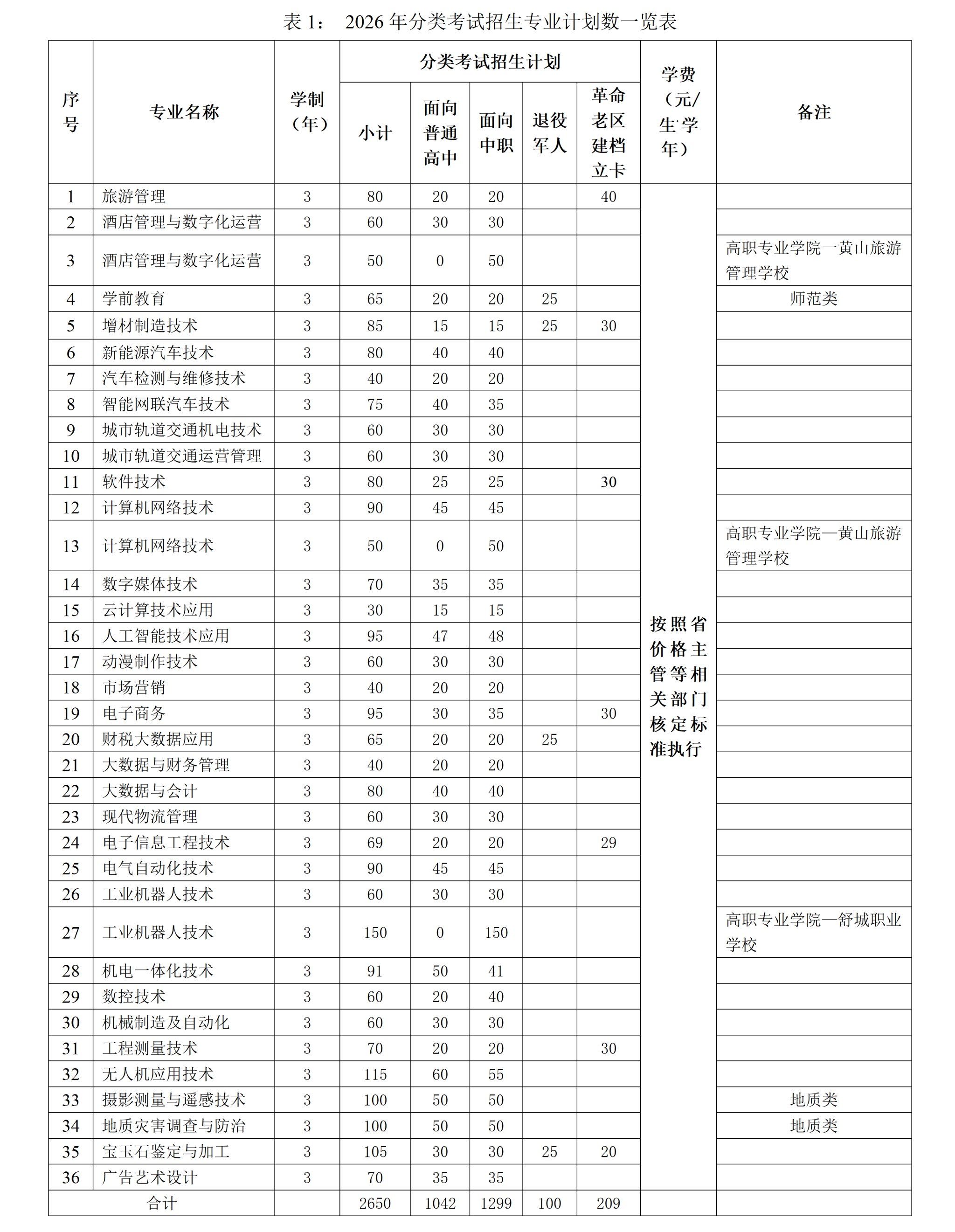 特别提醒:填报酒店管理与数字化运营专业学院计划和计算机网络技术专业学院计划的学习地点在黄山旅游管理学校,填报工业机器人技术专业学院计划的学习地点在舒城职业学校,以上高职专业学院学生须在对应培养地完成学业。