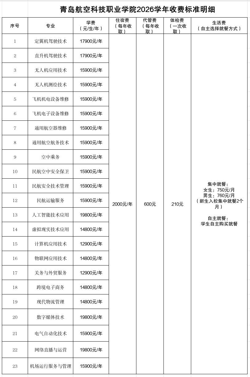 青岛航空科技职业学院2026学年收费标准明细公示(三年制)