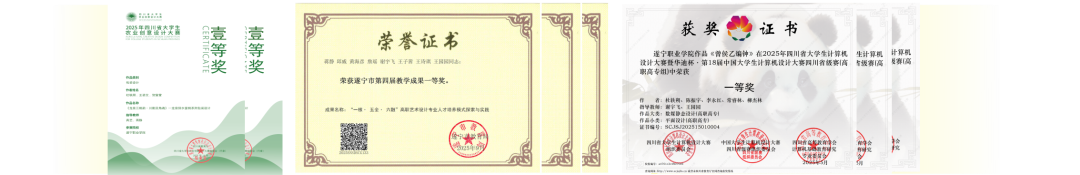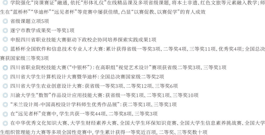 学院坚持“岗课赛证”融通育人,依托“形体礼仪”在线精品课程及多项省级课题,将本土非遗、红色文旅等元素深度融入教学。师生在“蓝桥杯”“华迪杯”“远见者杯”等各级各类竞赛中屡获佳绩,充分彰显“以赛促教、以赛促学”的育人成效。近年来,主要荣誉包括:
