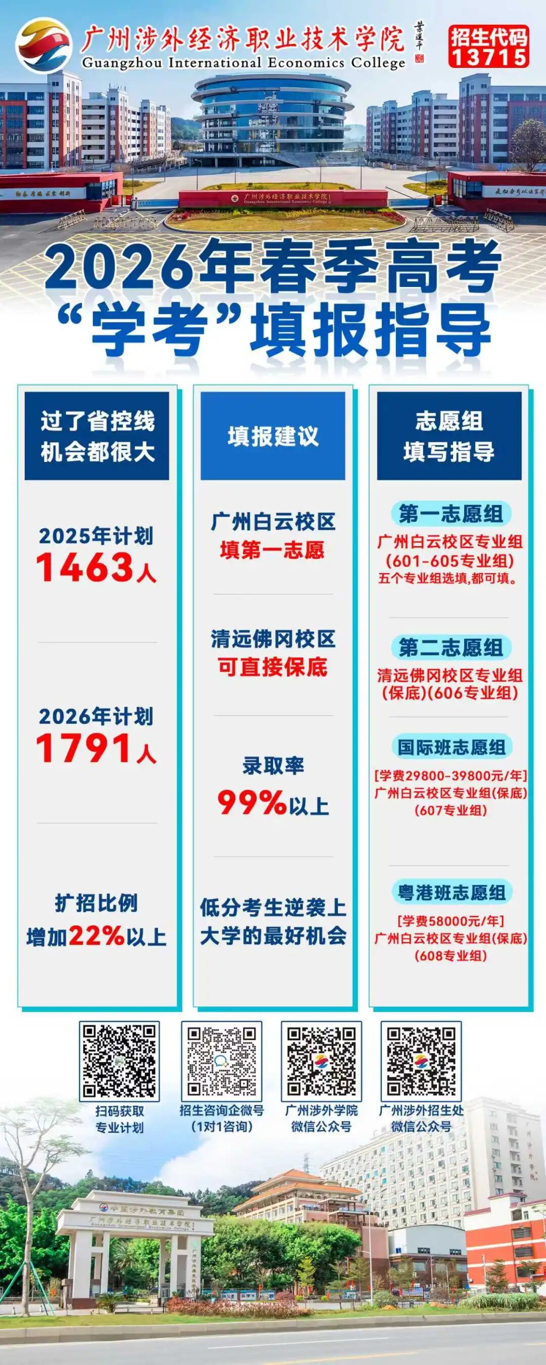 广州涉外经济职业技术学院招生章程:重点关注录取规则(我校实行“专业志愿优先”原则,所以第一专业志愿非常重要!)及校区安排。