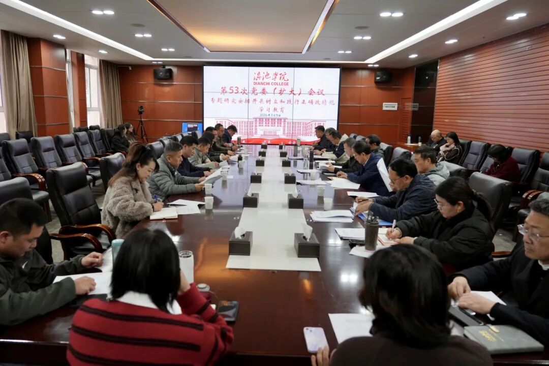 2026年3月9日,滇池学院召开党委(扩大)会议,深入学习贯彻习近平总书记关于树立和践行正确政绩观的重要论述、关于开展学习教育的重要指示精神,认真学习贯彻中央党的建设工作领导小组、省委党的建设工作领导小组会议精神和省委教育工委、省教育厅党组会议要求,专题研究安排开展树立和践行正确政绩观学习教育。校党委书记陈炳灿主持会议并讲话。