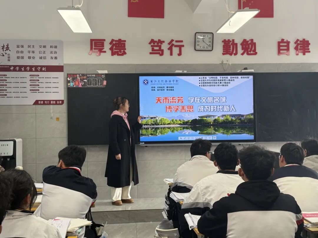 2026年1月24日,我回到自贡市第一中学开展招生宣讲。提前对接招办熟悉校情专业、结合自身经历准备宣讲内容,在高三班级以自身求学路为切入点,为学弟学妹讲解旅院的校情、专业、校园生活与升学就业,还耐心解答了他们的各类疑问。这次宣讲不仅让学弟学妹了解了丽院,我也在实践中收获了成长,更体会到作为旅院学子的责任。愿学弟学妹们坚定目标、奋力拼搏,期待在玉龙雪山脚下的旅院,与他们相遇,共赴美好青春。