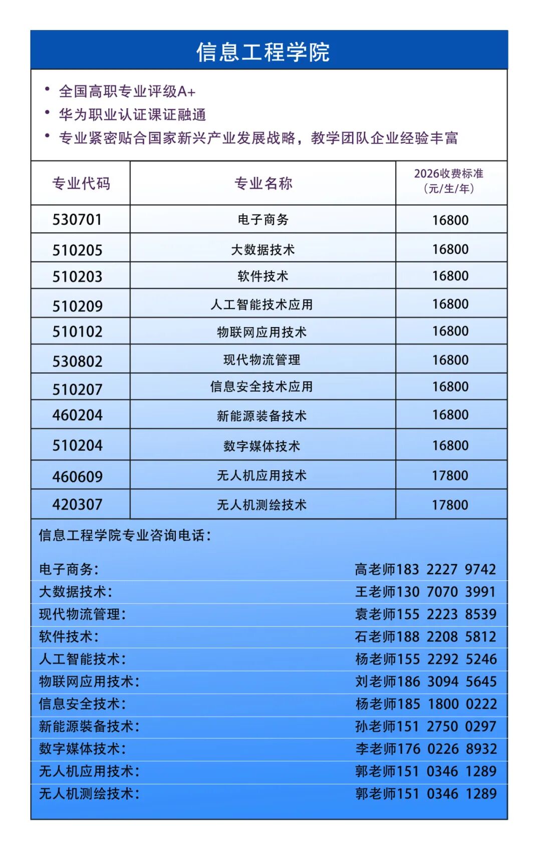 信息工程学院聚焦人工智能、数字媒体、大数据、物联网、低空经济等新兴领域,开设大数据技术、人工智能技术应用、无人机应用技术等11个专业。引入华为课程及认证体系,校企联合培养,学生就业形势好。(详情点击下方图片,了解更多信息工程学院信息)