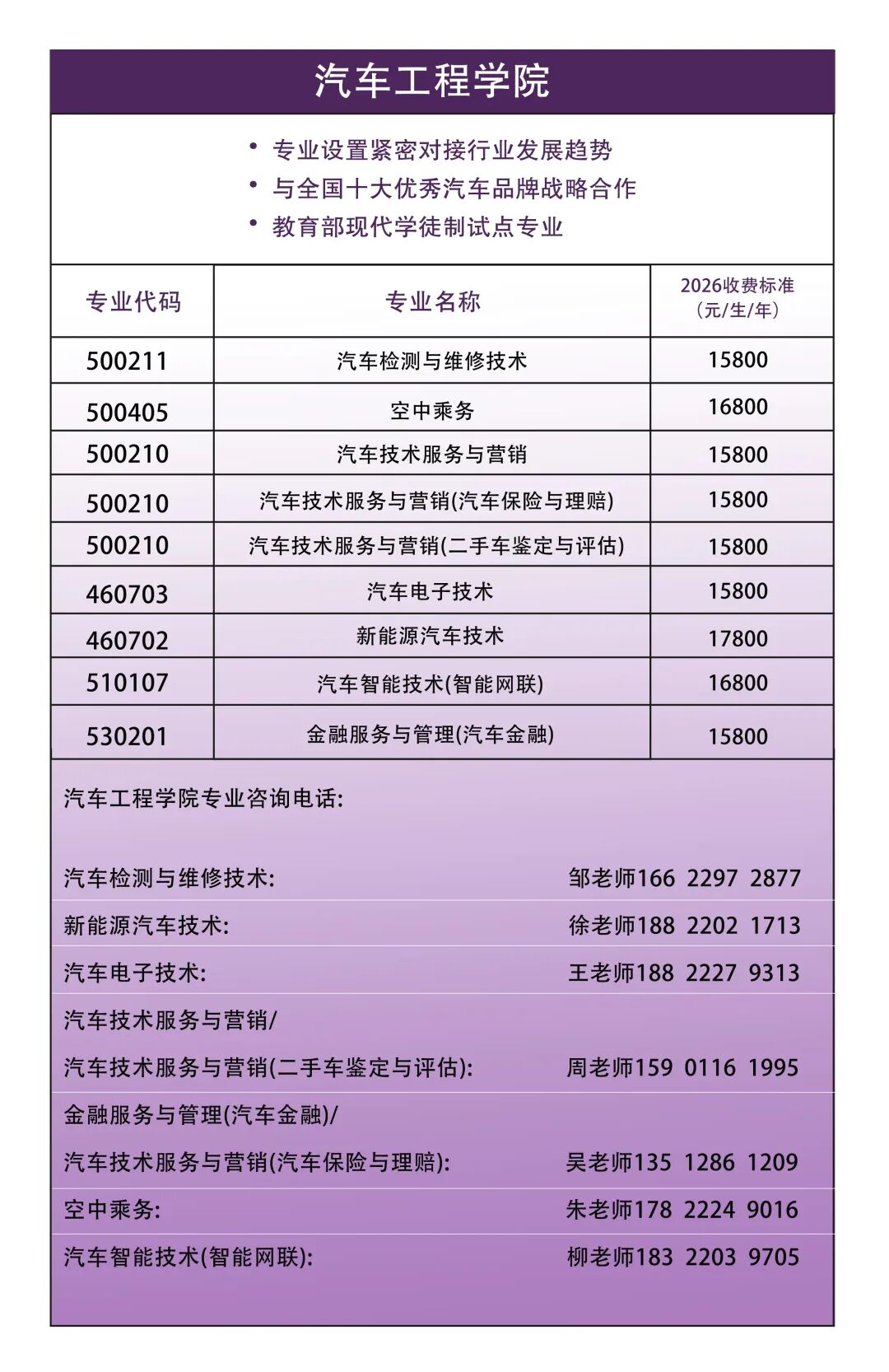汽车工程学院紧密对接天津市“1+3+4”现代工业及服务业体系,紧跟科技发展趋势和市场需求,依托国家级高技能人才培训基地,深化中国特色学徒制,培养适应产业升级的高素质技能人才。(详情点击下方图片,了解更多汽车工程学院信息)