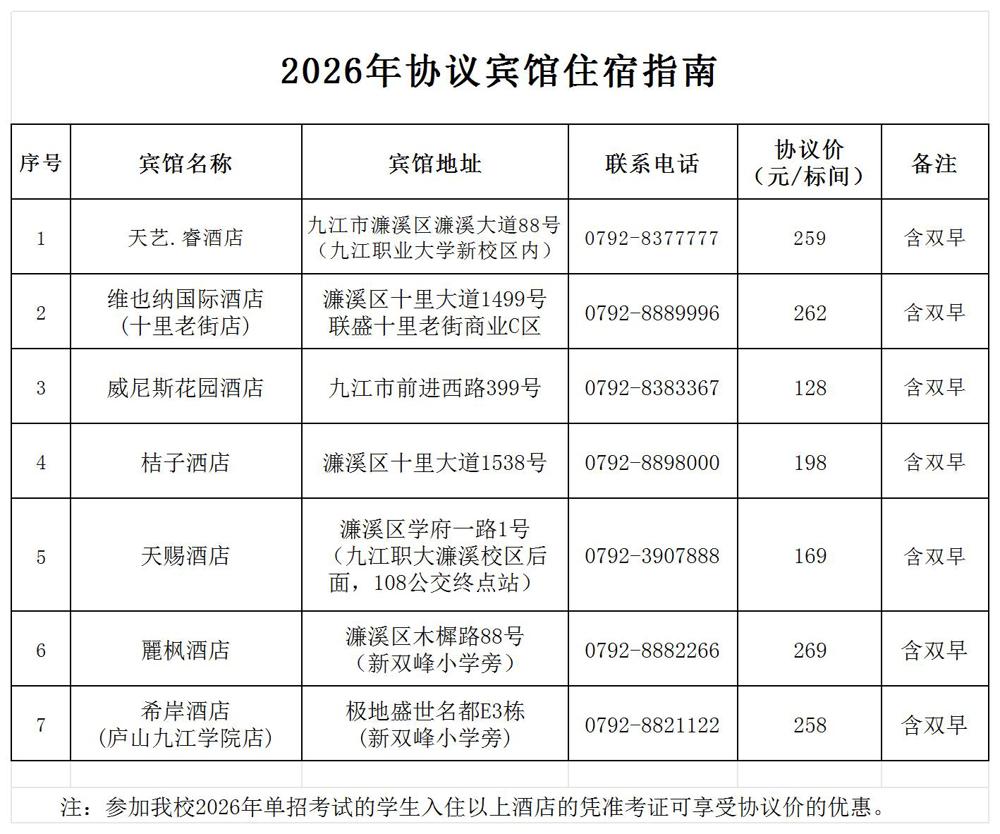 我校2026年高等职业教育单独招生技能考试将于3月22日举行,在学校官网3月20日9:00-21日24:00开通网上打印准考证,为了服务好外地考生来我校参加单独招生考试,招生就业处已联系了学校附近的多家宾馆,并承诺我校考生凭单招考试准考证可按照协议价入住,住宿费由考生自理。学校网址:www.jjvu.jx.cn。
