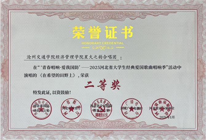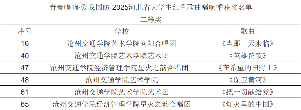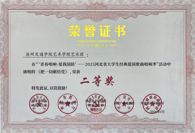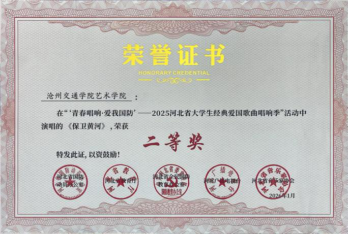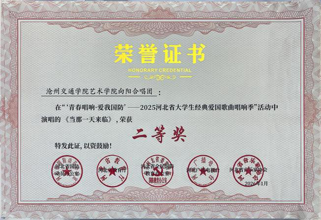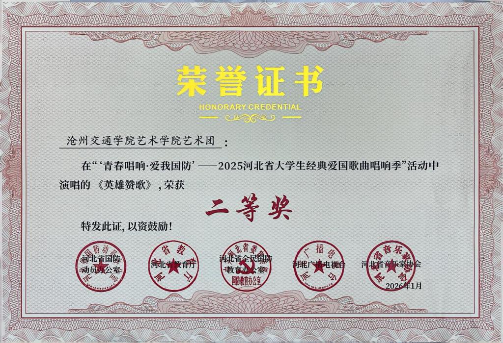 近日,“青春唱响・爱我国防”——2025河北省大学生红色经典歌曲唱响季暨国防教育活动获奖名单公示,我校报送的六首参赛曲目凭借出色的艺术呈现与深刻的主题表达,全部荣获二等奖,充分展现了我校学子的家国情怀与青春风采。