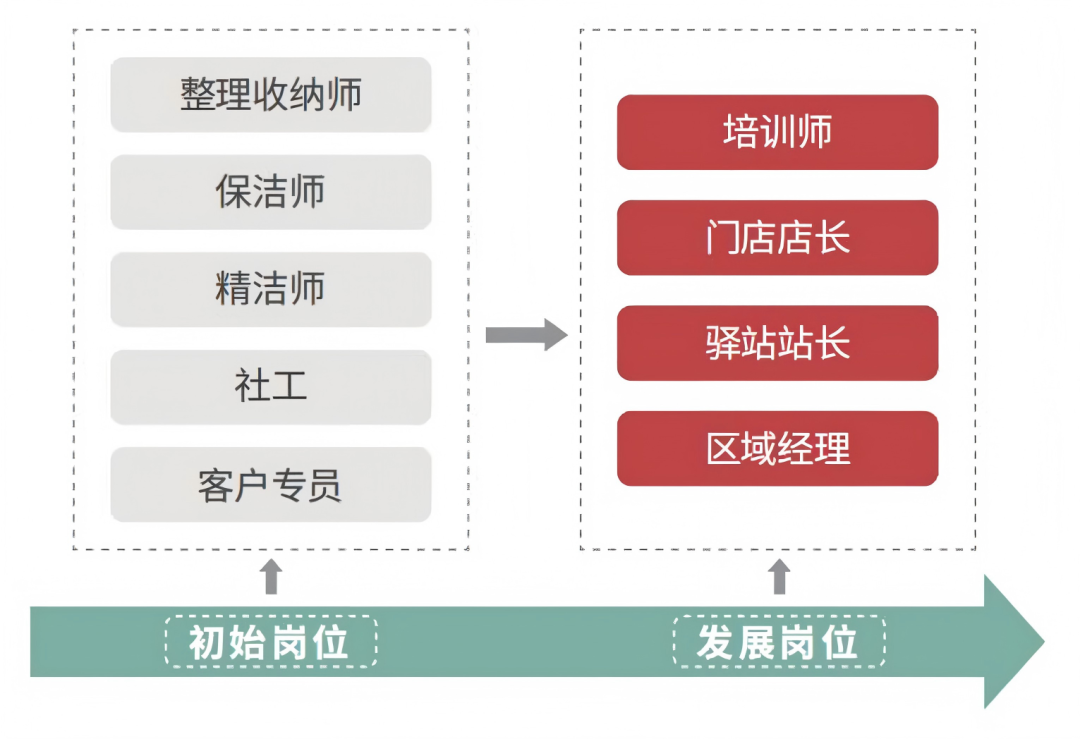 管理路线:门店店长、驿站站长、家政企业运营和中基层管理人员。