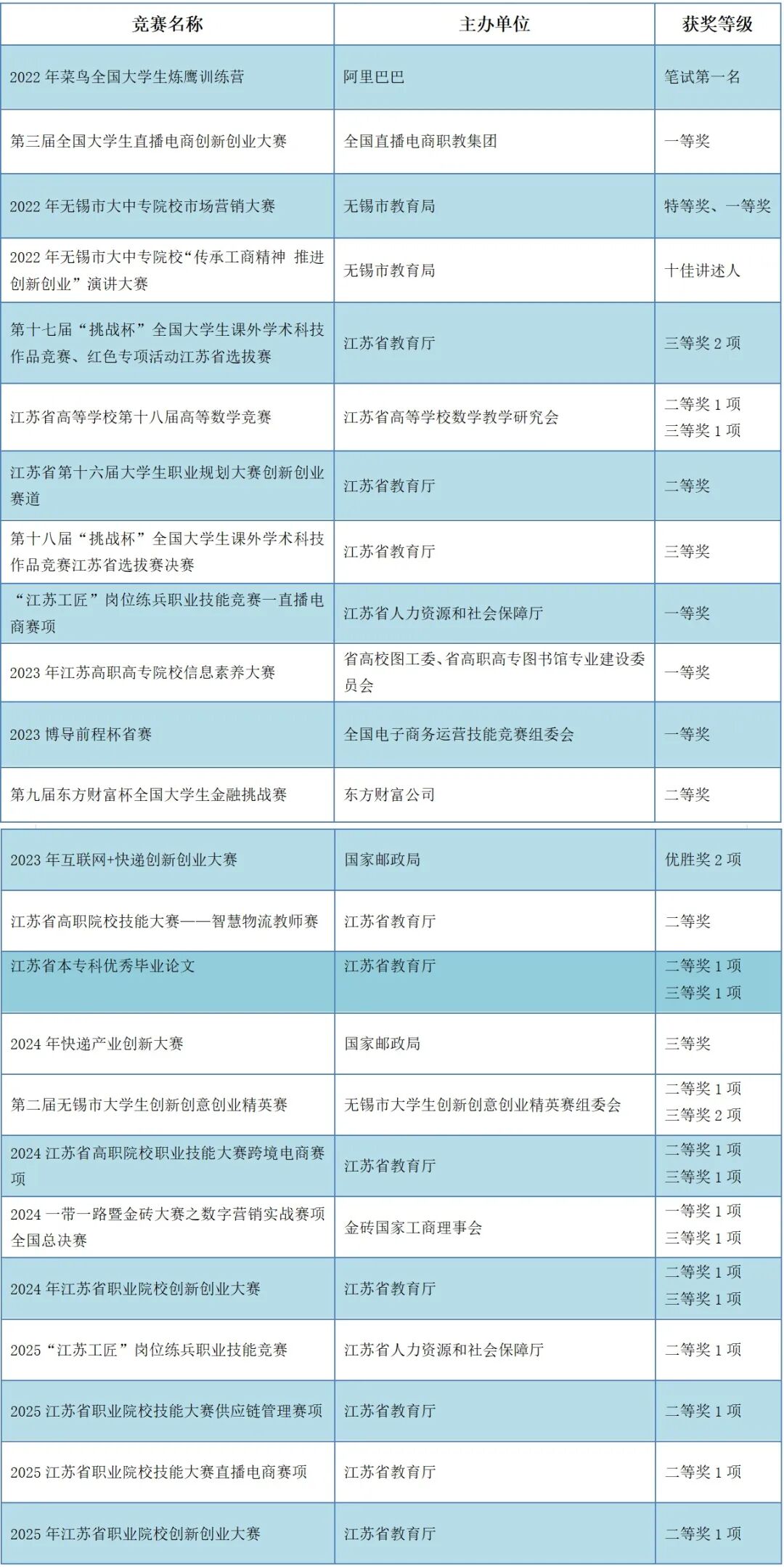近三年指导学生参加省级以上技能比赛,获得特等奖3项、一等奖9项、二等奖18项。与苏州顺丰速运有限公司、湖南茶悦文化产业发展集团有限公司、中国邮政速递物流股份有限公司无锡市分公司、京东乾石科技有限公司、浙江驿栈网络科技有限公司(菜鸟)、宜家(中国)投资有限公司无锡分公司、江苏红豆对外贸易有限公司等多家知名企业深度合作,开设“顺丰雏鹰班”“茶颜悦色学徒班”“菜鸟店长班”“宜家电子商务创新班”“典亮跨境电商创新班”等,探索“订单班”、“现代学徒制班”等人才共育模式。