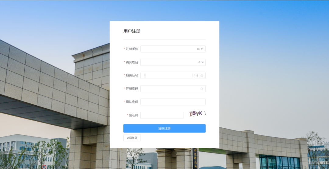 点击【注册账号】,依次输入手机号、姓名、身份证号、注册密码及验证码,提交完成注册。