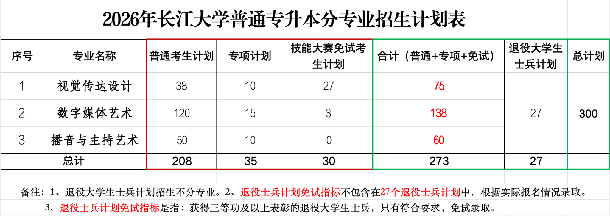 根据《省教育厅关于做好2026年湖北省普通高等学校专升本工作的通知》(鄂教高函〔2026〕2号)精神,我校2026年专升本招生总计划300名,其中普通考生计划208名、专项计划考生35名、技能大赛免试考生30名、退役大学生士兵计划27名(不含退役大学生士兵免试计划)。分专业招生计划见下表: