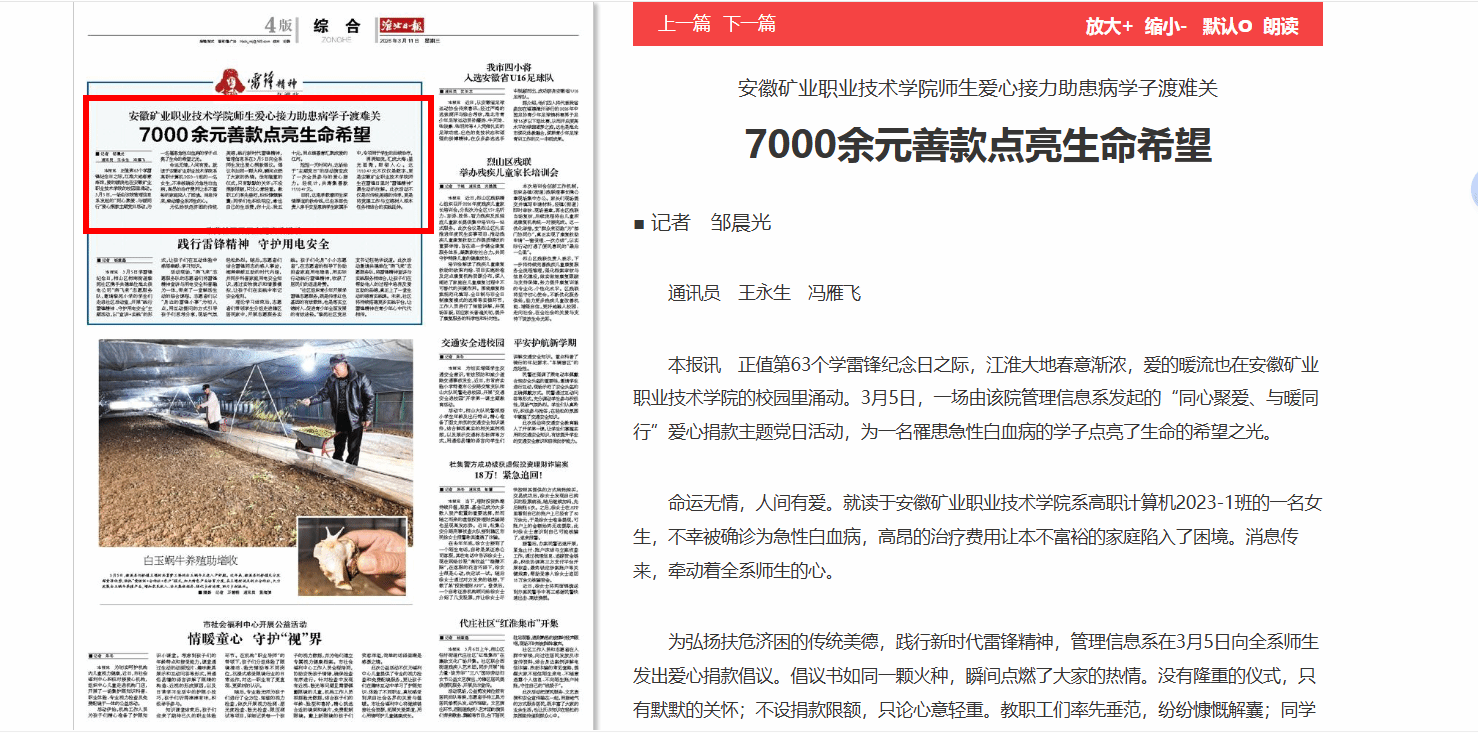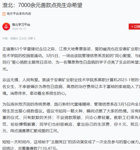 本报讯 正值第63个学雷锋纪念日之际,江淮大地春意渐浓,爱的暖流也在安徽矿业职业技术学院的校园里涌动。3月5日,一场由该院管理信息系发起的“同心聚爱、与暖同行”爱心捐款主题党日活动,为一名罹患急性白血病的学子点亮了生命的希望之光。
