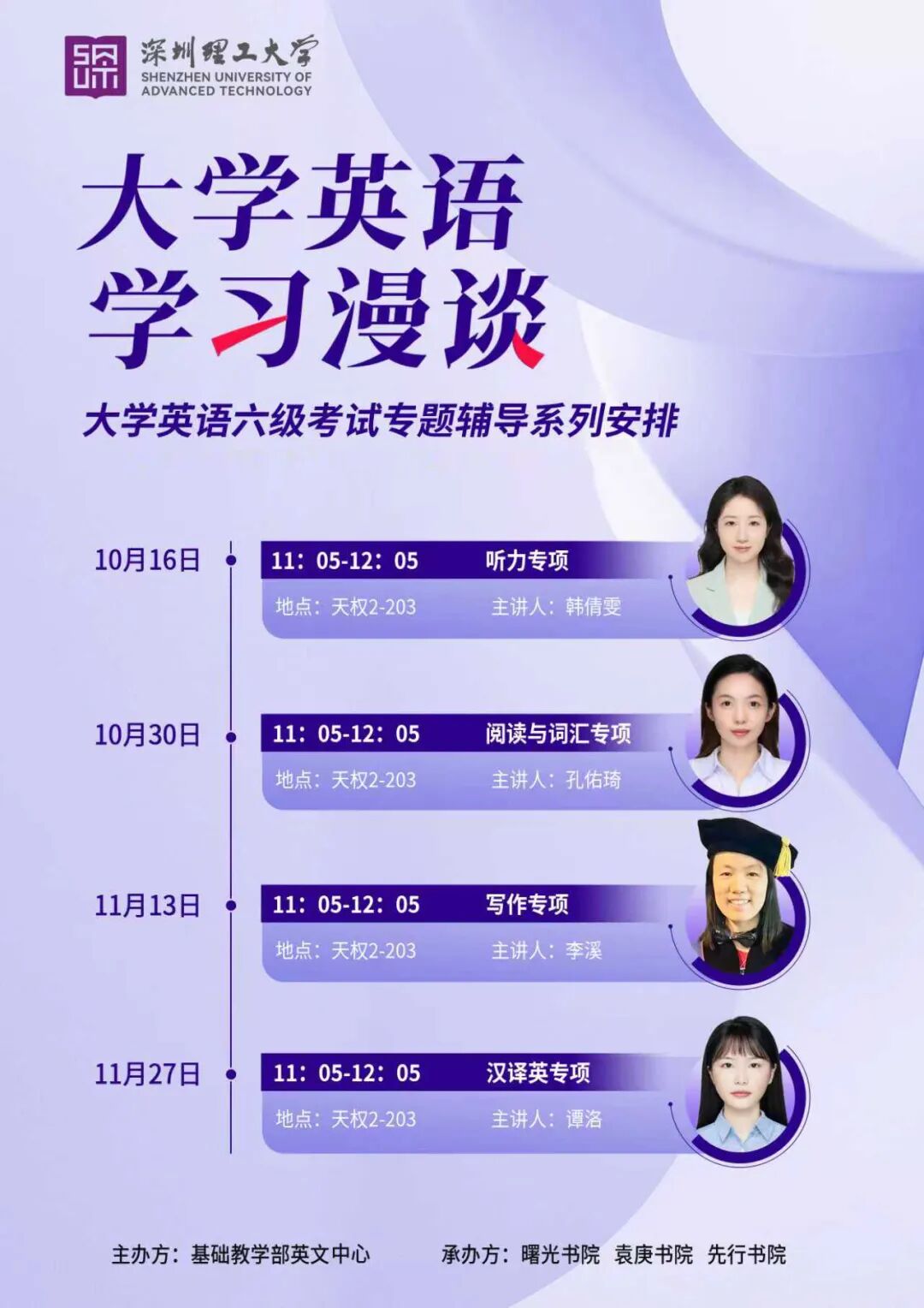 依托分级教学与小班化教学优势,中心搭建了分层分类课程体系,精准适配学生个性化学习节奏。课外打造“教学—辅导—实践”全链条支持体系,通过六级专项辅导、Office Hour一对一答疑、写作面批等形式,为学生备考提供全方位保障。同时,中心与各书院深度协同,开展English for Today(每日英语)、名师有约、首届全英文曙光科学节、English for Today海报成果展等丰富多彩的跨文化交流活动,营造沉浸式英语学习氛围,推动学生语言能力在日常积累与实践中稳步提升。