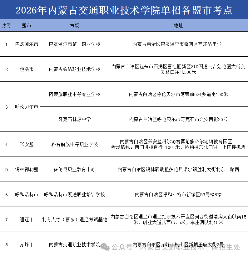 2026年内蒙古交通职业技术学院单招各盟市考点发布