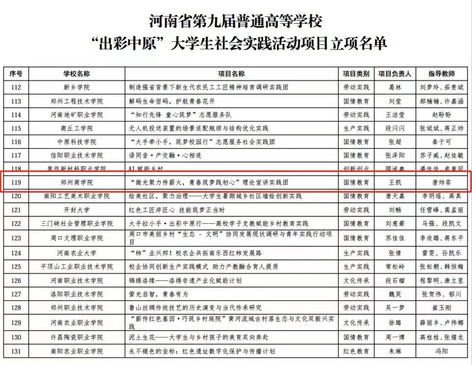 近期,河南省教育厅发布《关于组织开展第九届普通高等学校 “出彩中原”大学生社会实践活动的通知》。经各高校推荐申报、省教育厅组织专家评审,全省共评出140个立项项目,我校文学与新闻传播学院申报的《“微光聚力传薪火,青春筑梦践初心”理论宣讲实践团》项目,成功入选第九届河南省普通高校“出彩中原”大学生社会实践活动国情教育类立项名单。