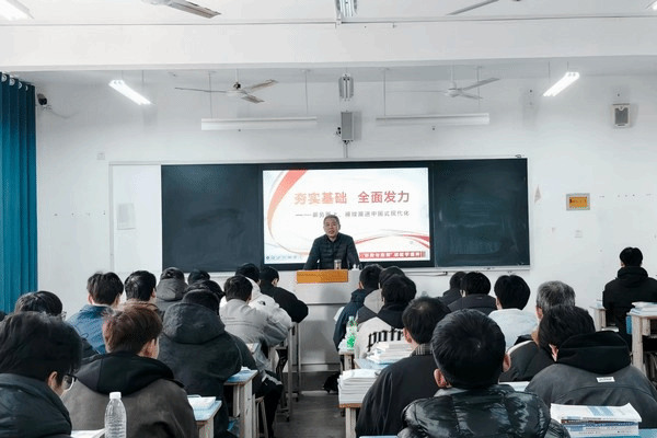 学院副院长赵铁塔主讲了《夯实基础 全面发力——乘势而上,接续推进中国式现代化》。他紧扣主题,用通俗语言和鲜活案例,阐释了五年规划的意义——这是党治国理政的宝贵经验,更是推进中国式现代化的重要保障。他带领学生回望新时代辉煌成就,细数消除绝对贫困、全面建成小康社会的壮举,让同学们深切感受祖国发展力量,使命感油然而生。