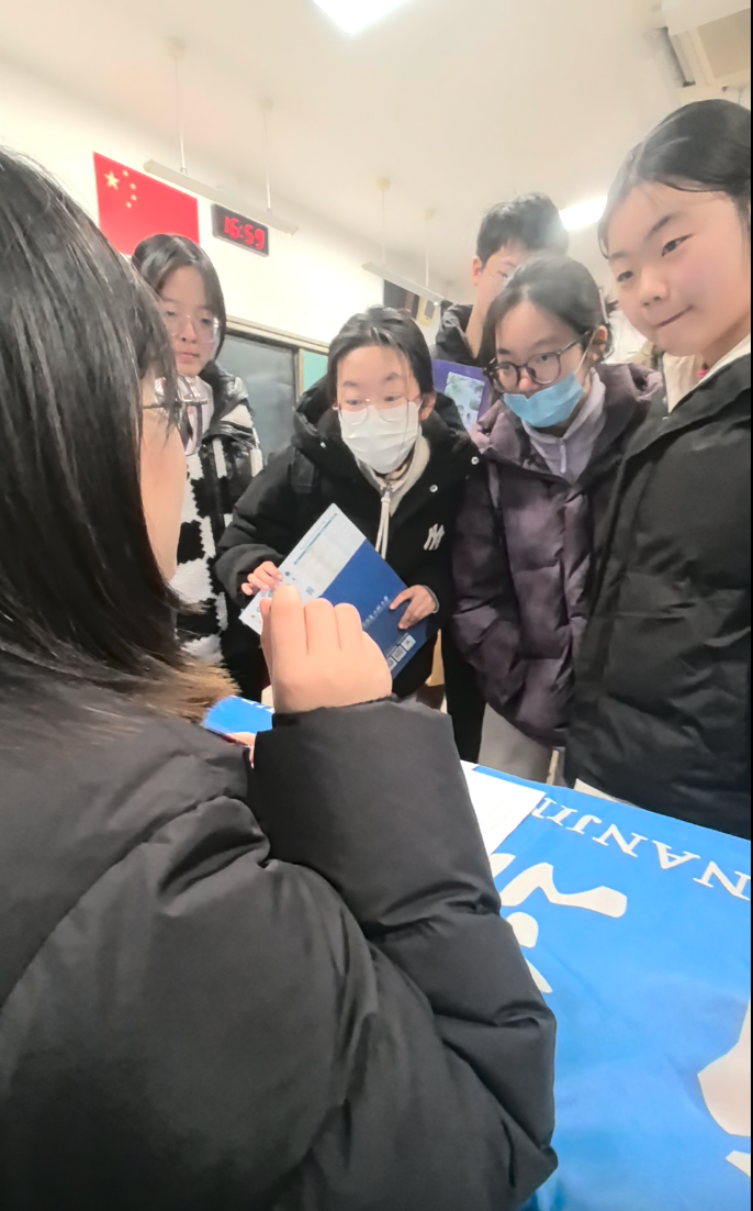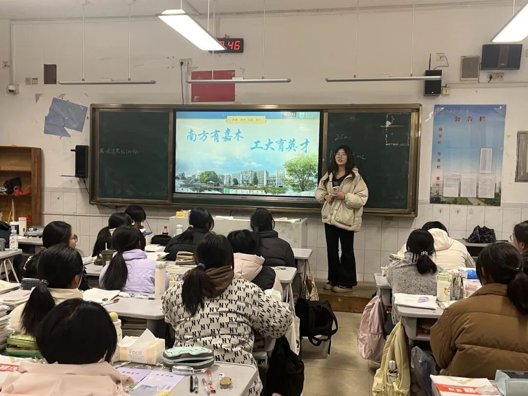 活动期间,首先与高中班主任和地理老师取得联系,确定了回校宣讲的日期。随后,作为队长的我一头扎进资料收集的工作中。从学校官网下载精美的校园图片、整理详实的招生数据,到剪辑精彩的校园生活视频,并且根据学院和学校的培训指导,精心制作了一份内容丰富、生动有趣的宣讲PPT。为了让互动环节更具吸引力,我还准备了带有天宝阁的徽章、南工大手绘明信片等小礼品。
