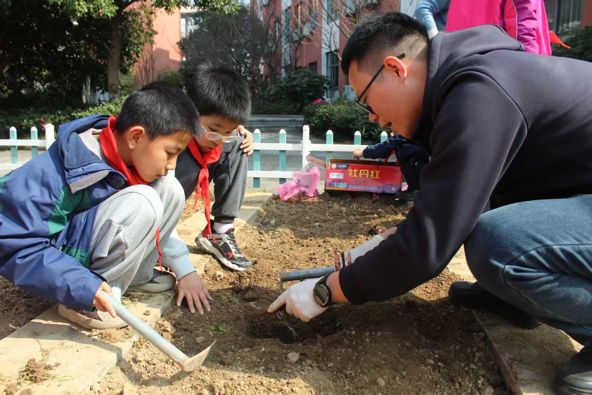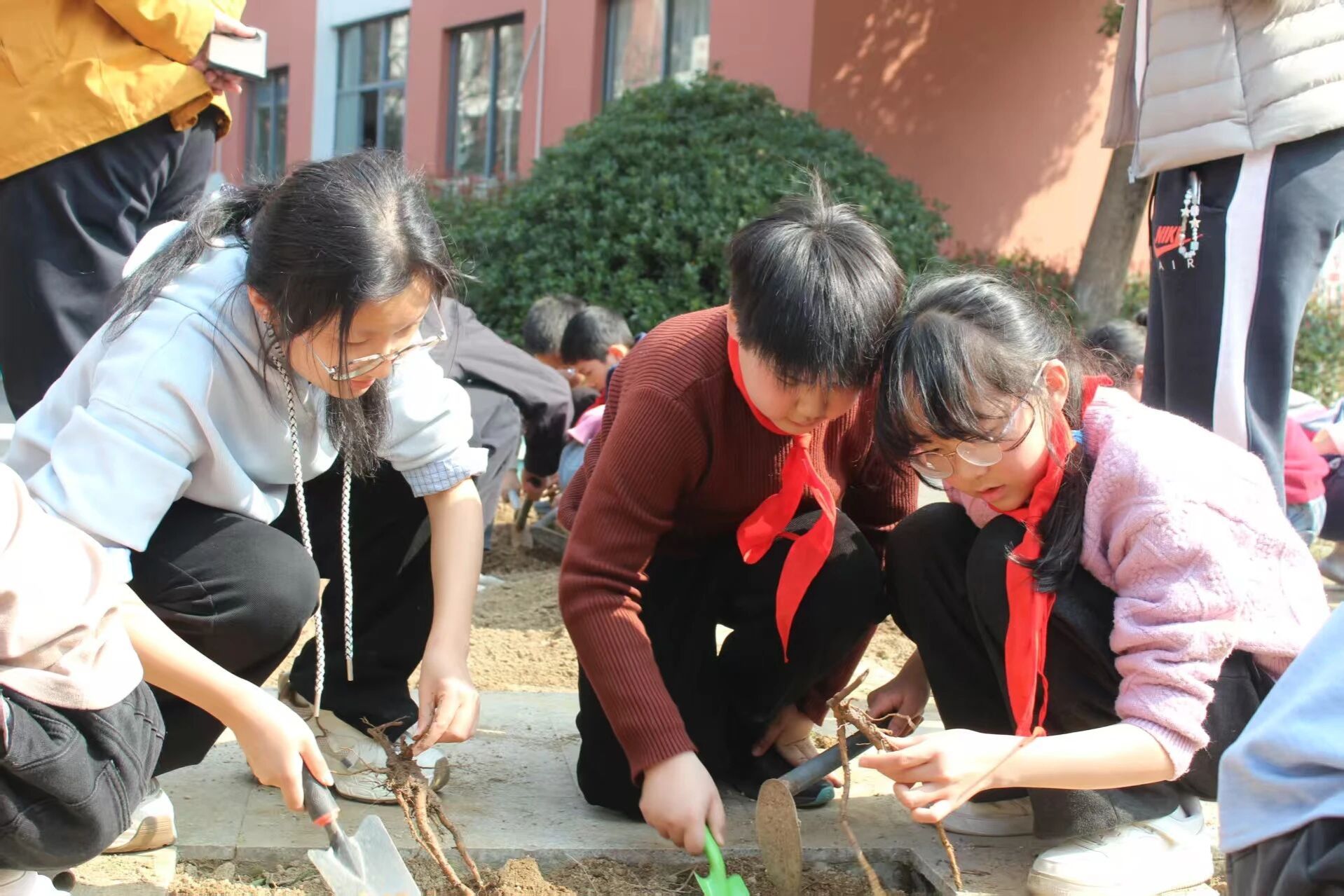 活动现场热情高涨,众多“科技小苗”在师生志愿者帮助指导下,纷纷拿起小铁锹、小水桶,认真开展平地、挖坑、种苗、培土、浇水等操作,一起栽种了黄精、白芍、牡丹、玄参等十余种近300平方区域的中药材幼苗。大家一同感受生命的力量,体验劳动的快乐,学习中药的科技密码。