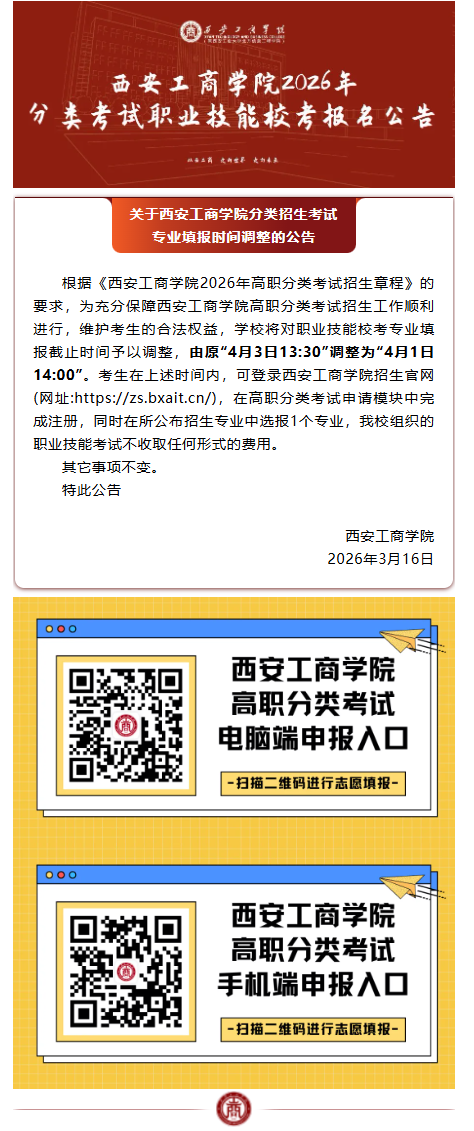 关于西安工商学院分类招生考试专业填报时间调整的公告