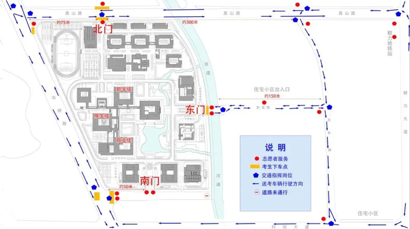 1.考试当天8:00后,考生可凭本人有效居民身份证(身份证丢失的持派出所办理的临时身份证或者带有本人照片并加盖户籍专用章的户籍证明)和准考证经学校南门(华桥路)、北门(高山路)、东门(卧龙路)过智能安检门进入校园。建议自驾或打车前往的考生从南门进入,车辆即停即走。考试期间,送考家长及车辆不得进入校园,请将车辆停放至学校附近(具体见第四部分出行方式)。各校门到考场步行时间约为10分钟,请提前安排好时间。