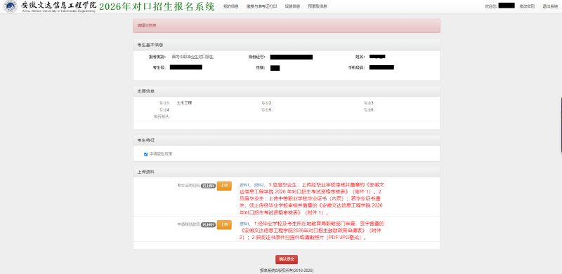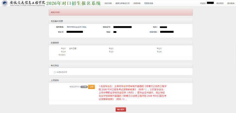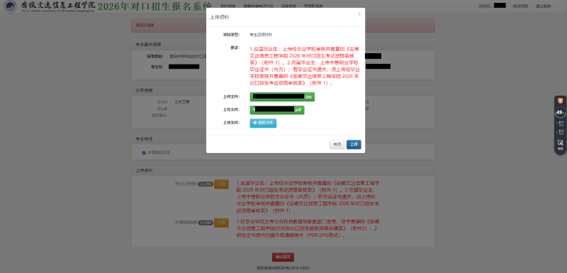 1.应届毕业生:上传经毕业学校审核并盖章的《安徽文达信息工程学院2026年对口招生考试资格审核表》(附件1)。