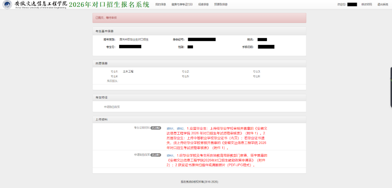 考生完成报名及志愿填报后,须在上述规定时间内登录我校“2026年对口招生报名系统”提交相关证明材料,逾期不予受理。所有材料须为清晰可辨的扫描PDF格式或JPG 格式图片,确保内容完整。
