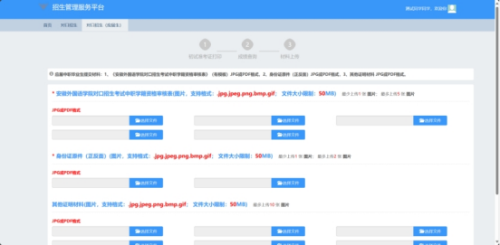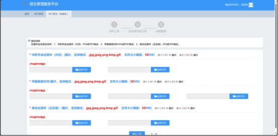 (2)往届毕业生所需提交的材料:①本人中职毕业证原件(内页),jpg格式上传;②加盖毕业学校公章的学籍表复印件,jpg格式上传;③身份证原件(正反面),jpg格式上传。