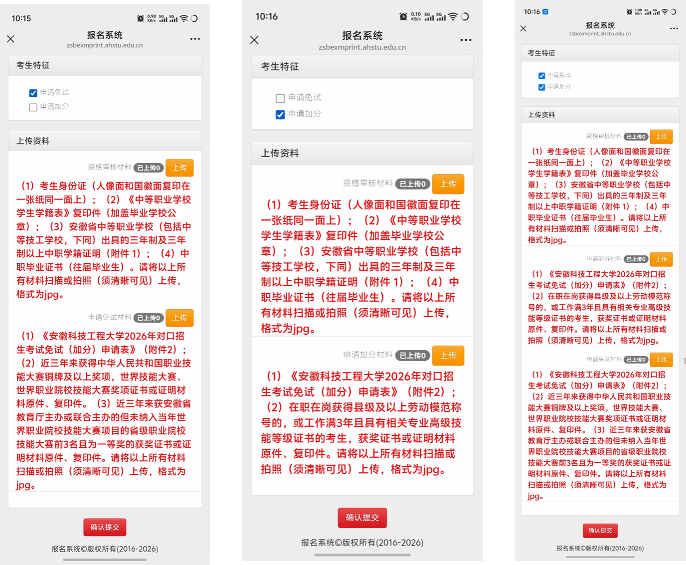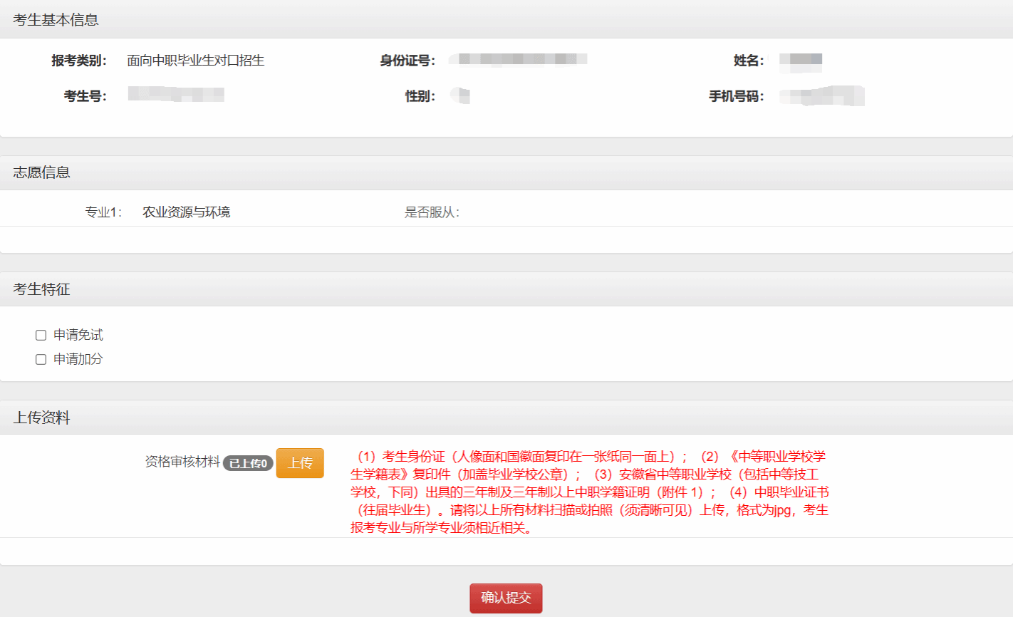 第六步:申请技能大赛免试、考试加分鼓励政策的考生,在“考生特征”板块,还需先勾选自己申报的鼓励政策选项,在上传“资格审核材料”基础上,按照要求上传“申请免试材料”或者“申请加分材料”。无误后,点击确认提交按钮,一旦提交,不可更改。