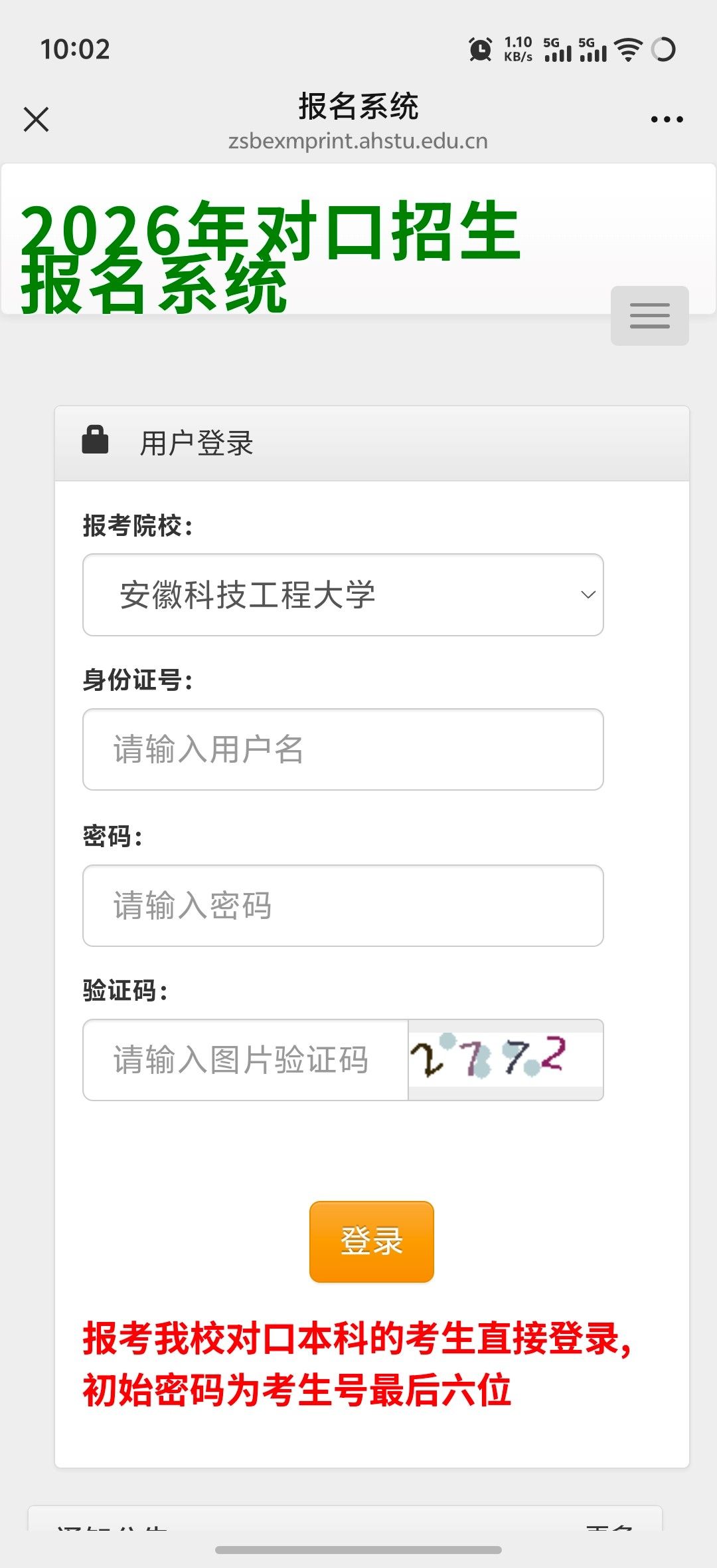 各位对口考生: 安徽科技工程大学2026年对口报名系统,主要用于考生资格审查材料上报,技能大赛免试、加分鼓励政策材料上报。考生本人须及时查询审核状态,及时修正审核不通过项目,并对因未及时更正信息提交重新审核产生的遗留问题负责。使用中如有疑问,请咨询安徽科技工程大学招生办公室0550-6732041,0552-3197041。(材料上传时间为3月19日—3月20日23:00)