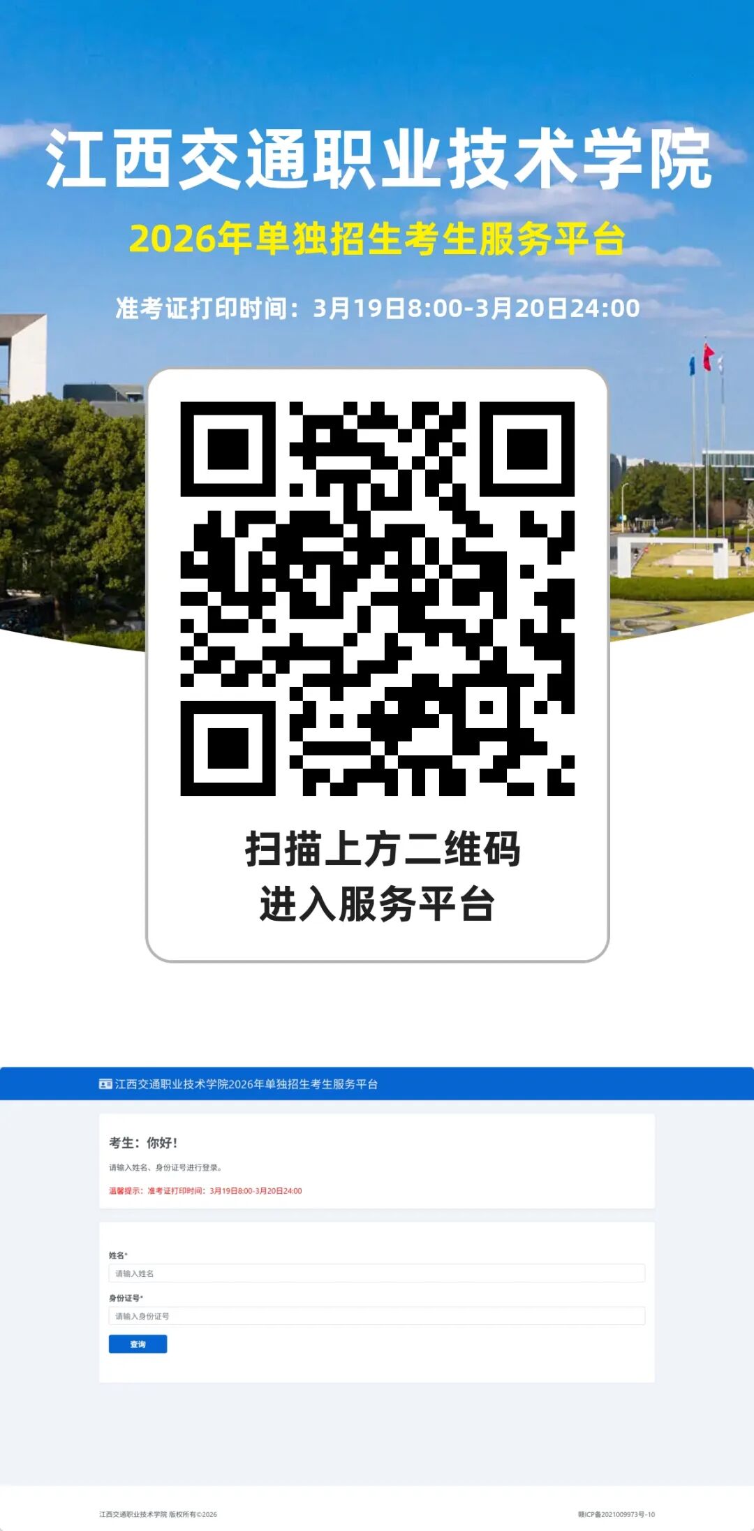 3月19日-3月20日期间,报考我院单招考试(技能校考)的考生登录江西交通职业技术学院招生信息网(网址:https://zsb.jxjtxy.edu.cn/)点击“江西交通职业技术学院2026年单独招生考生服务平台”飘窗进行线上考试确认及准考证打印。具体操作流程如下: