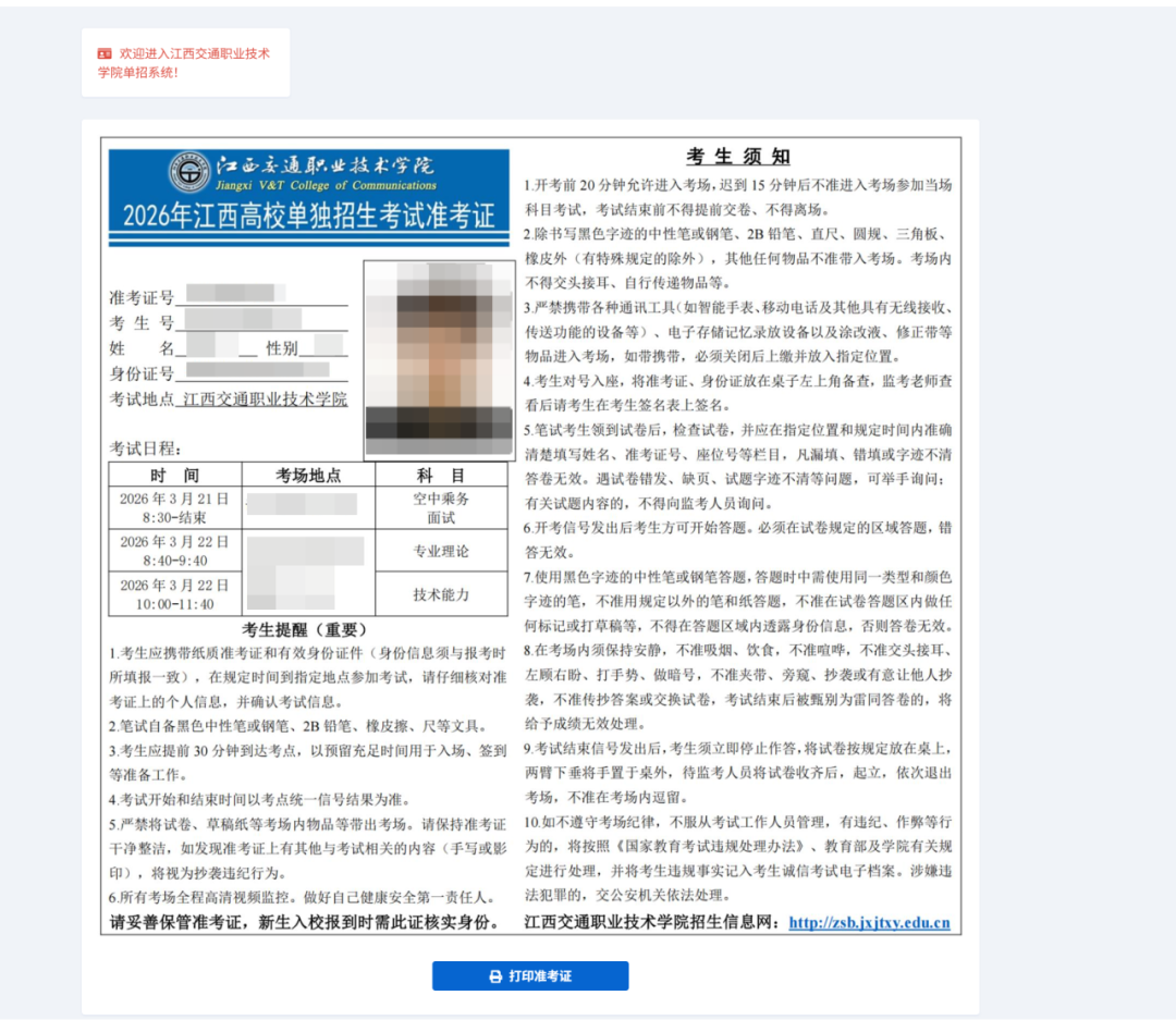 温馨提示:下载后请自行打印并妥善保管自己的准考证。报考空中乘务专业的考生,请及时登录我院招生网查阅《学院2026年单独招生空中乘务专业考生面试考核方案》,并按要求做好相关准备。
