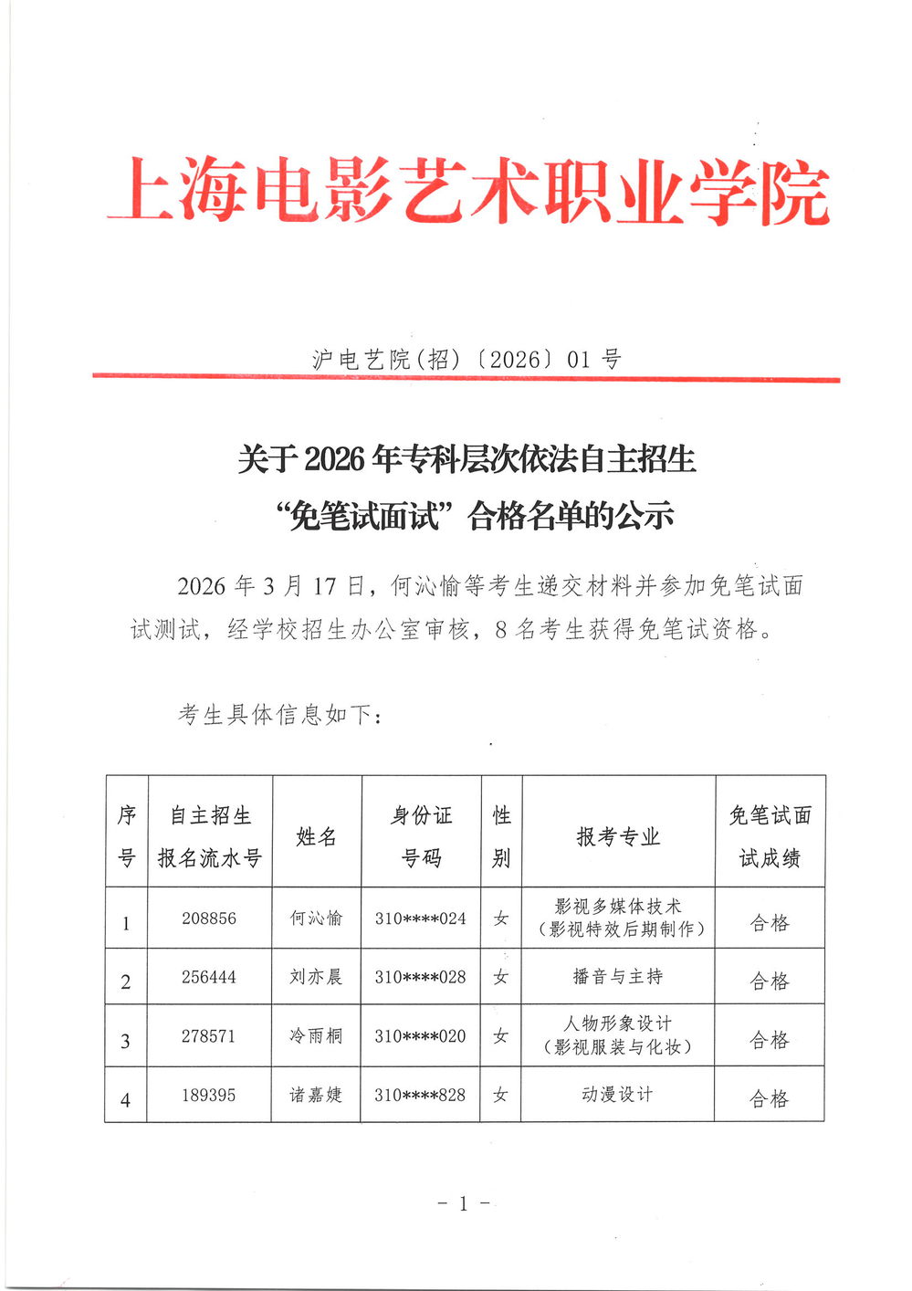 2026年 上海市专科层次依法自主招生 “免笔试面试”合格名单公示
