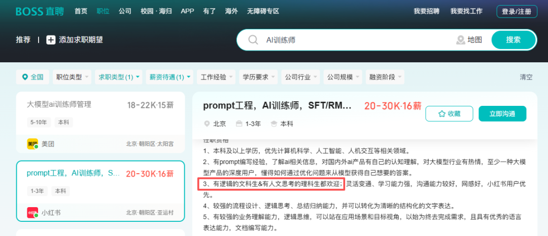 打开招聘软件,你会发现这场变革已经落地。AI大模型评估专家(写作方向)、AI叙事设计师、AI训练师——这些看似硬核的技术岗位,招聘要求里赫然写着