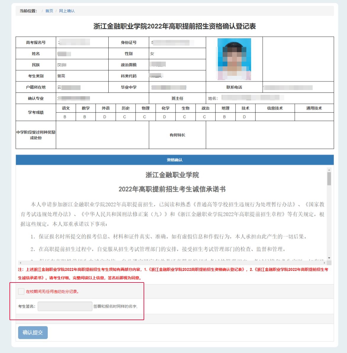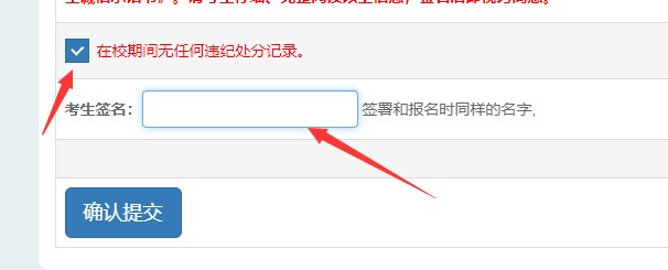 第五步:考生签名,签订考生诚信承诺书,确认提交,完成网上确认环节。逾期未完成确认的,视为放弃报名资格。