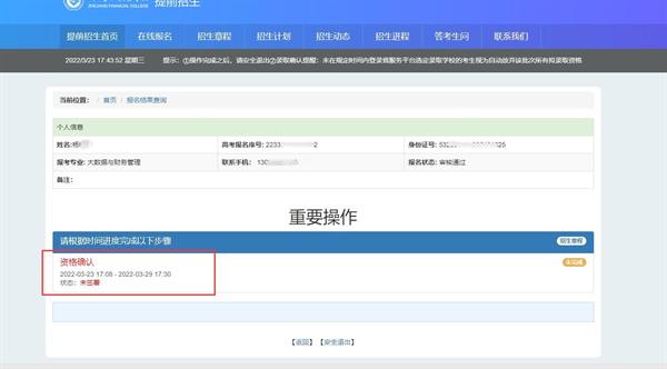 2026年3月24日9:00至3月31日17:00,浙江金融职业学院2026年高职提前招生报名系统中资格审核合格的考生务必登录学校招生信息网(http://zsb.zfc.edu.cn),点击下方的《浙江金融职业学院2026年高职提前招生考生须知》进行确认。逾期未完成确认的,视为放弃报名资格。具体步骤如下: