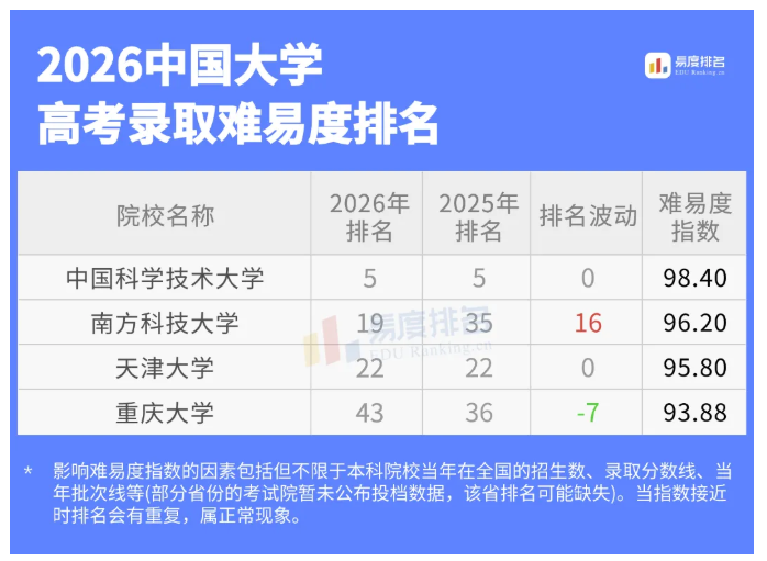2026年易度最新大学排名已更新,想要了解更多大学的录取难度排名,进入易度排名公众号。