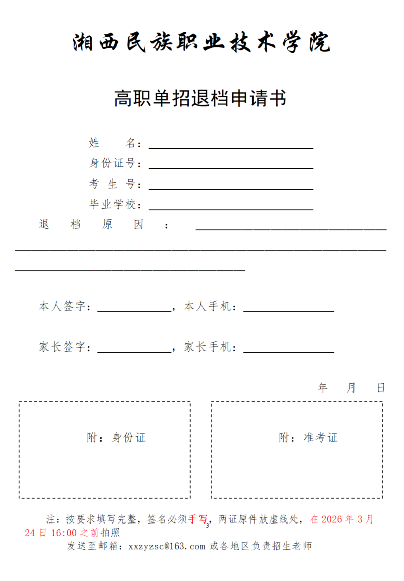 根据湖南省教育厅《关于做好我省2026年高职院校单独招生工作具体事项的通知》要求、《湘西民族职业技术学院2026年高职单招章程》及《湘西民族职业技术学院2026年体育特长生高职单招方案》规定,我校按照“分数优先”的原则对参加我校2026年单招一志愿考试考生分退役军人考生、体育特长考生、应届普通高中毕业考生、中职及往届高中毕业考生四个大类进行预录取,请考生点击湘西民族职业技术学院招生网首页下方“录取查询”,查询考生本人录取状态。放弃预录取资格的考生须手写《湘西民族职业技术学院单招退档申请书》(见附件),并于2026年3月24日下午16:00前将手写退档申请书扫描或拍照发送至我校招生就业处邮箱xxzyzsc@163.com,邮件主题为: