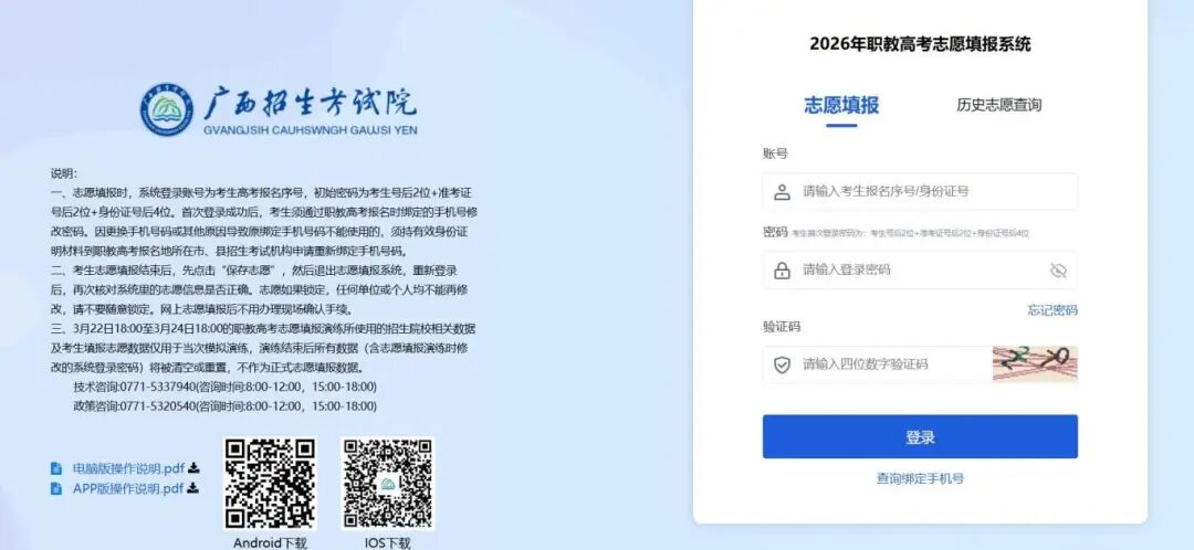 一、志愿填报时,系统登录账号为考生高考报名序号,初始密码为考生号后2位+准考证号后2位+身份证号后4位。首次登录成功后,考生须通过职教高考报名时绑定的手机号修改密码。因更换手机号码或其他原因导致原绑定手机号码不能使用的,须持有效身份证明材料到职教高考报名地所在市、县招生考试机构申请重新绑定手机号码。