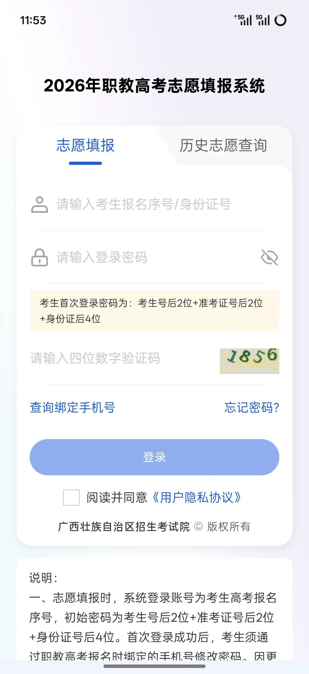 打开“八桂高考”APP,进入登录页面,输入证件号码、密码、验证码,勾选同意用户协议后点击【登录】。