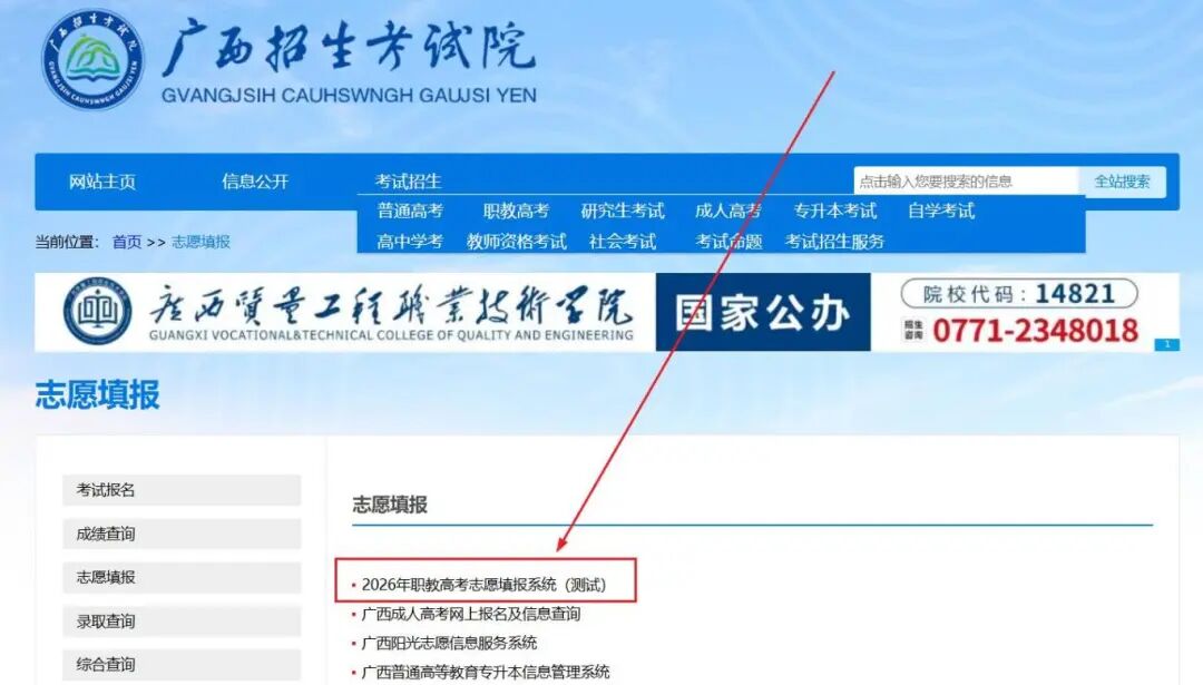 二、点击【志愿填报】中的【2026年职教高考志愿填报系统(测试)】。